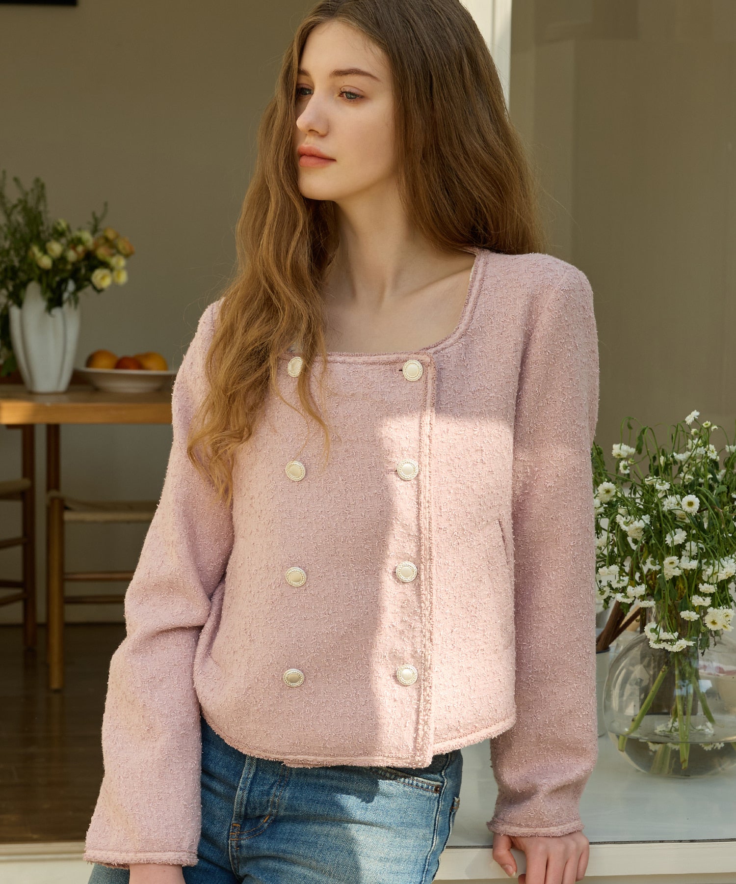 スクエアネックとダブルボタンディテールが映えるセミオーバーフィットのツイードジャケットです。