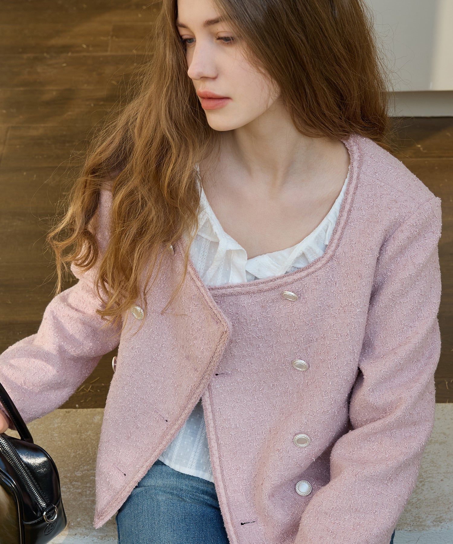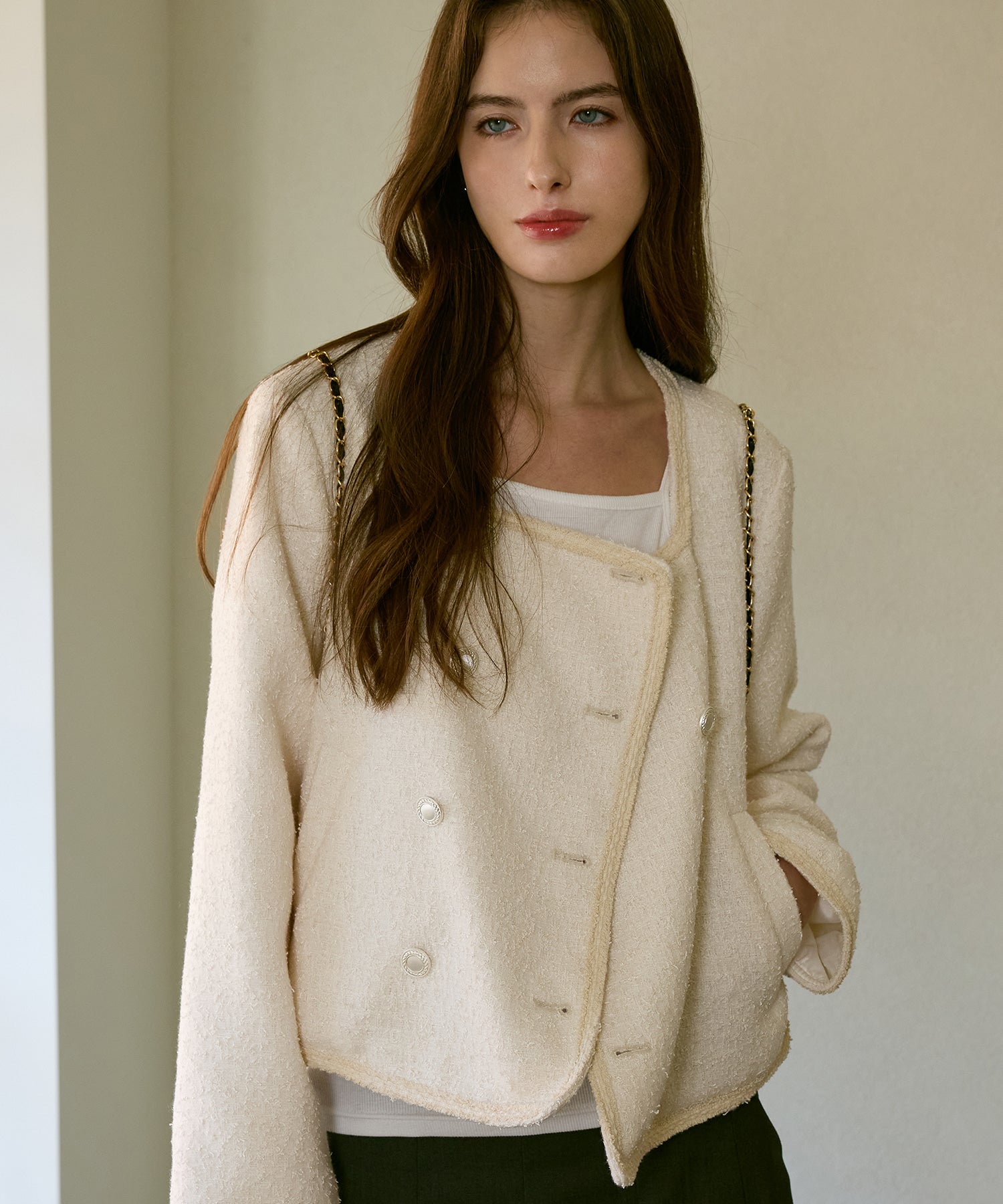 ダブルボタンのデザインは伝統的なツイードジャケットのエッセンスを取り入れつつ、トレンディでクラシックな雰囲気を演出。