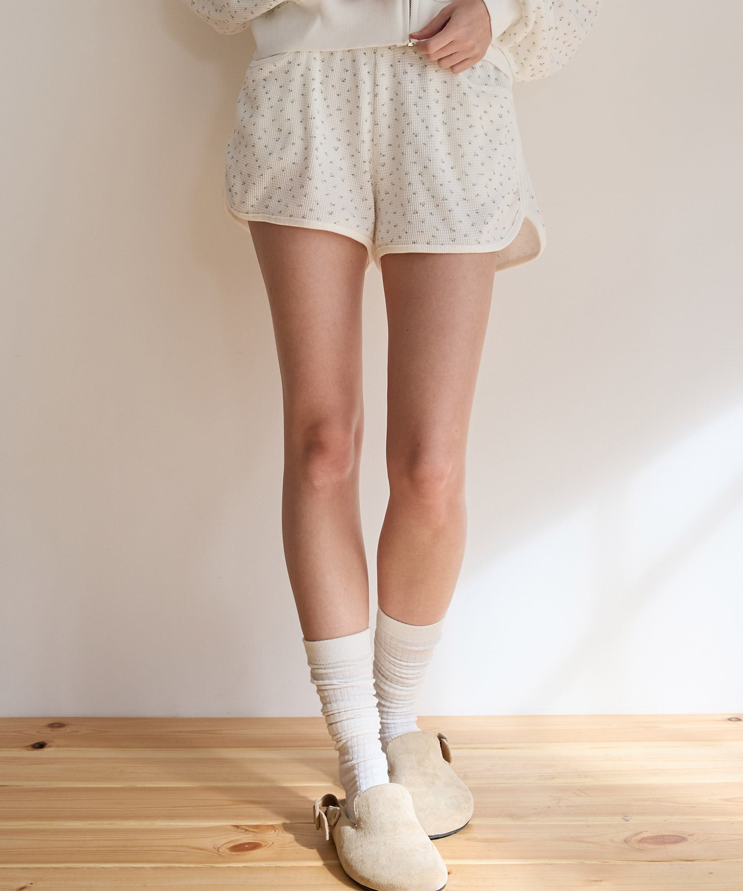 フラワーパターンのワッフル生地でユニークかつフェミニンに仕上げたショートパンツです。です。