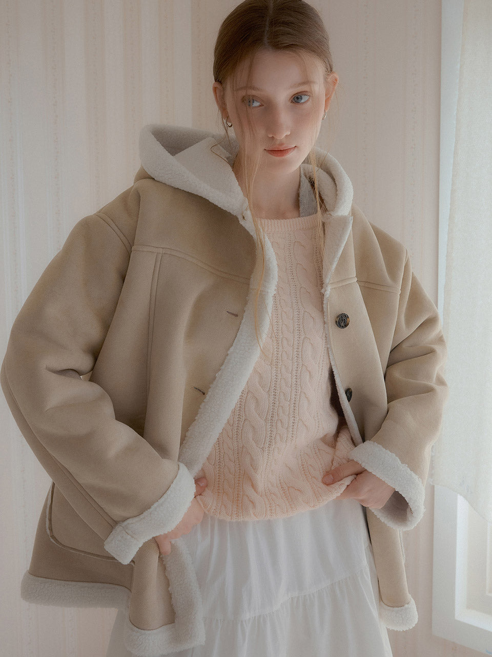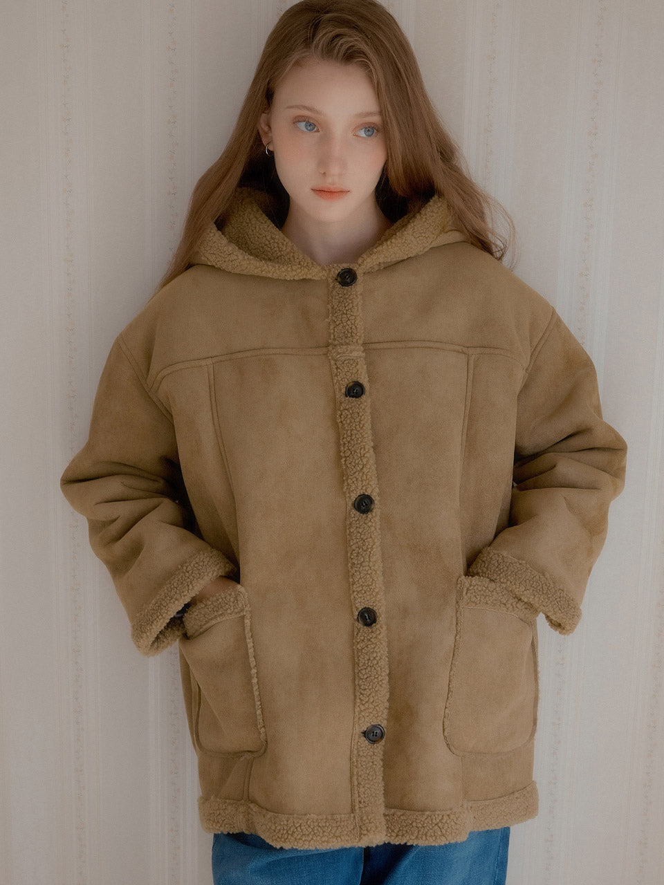表面はスエード特有のマットなテクスチャーが魅力で、内側にはふんわりとしたシェアリングボアを施し、真冬でも暖かく着用できます。フードや袖口、前立て、裾、ポケット部分にボアのポイントをあしらい、視覚的なアクセントと防寒性を両立しました。