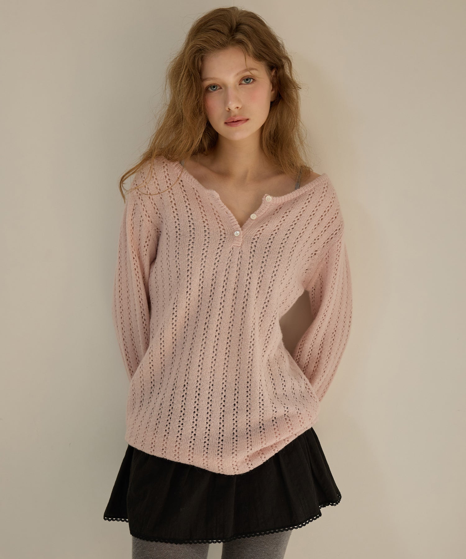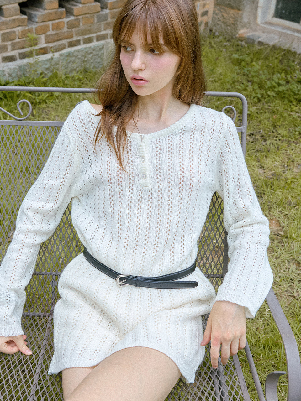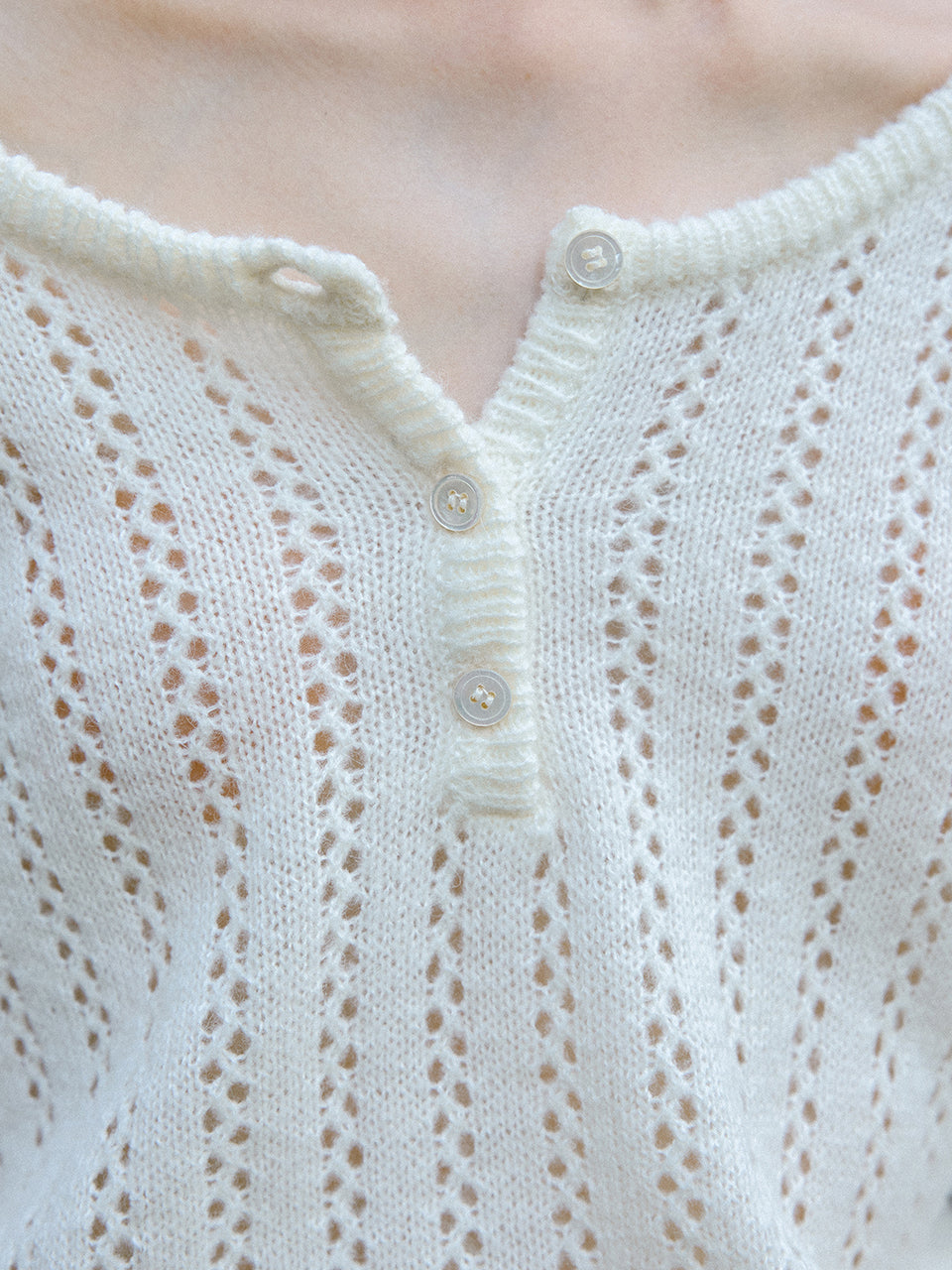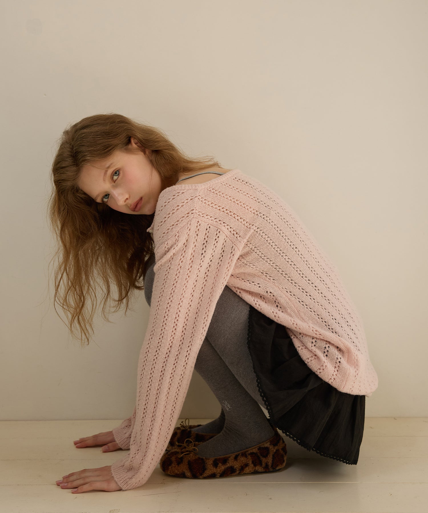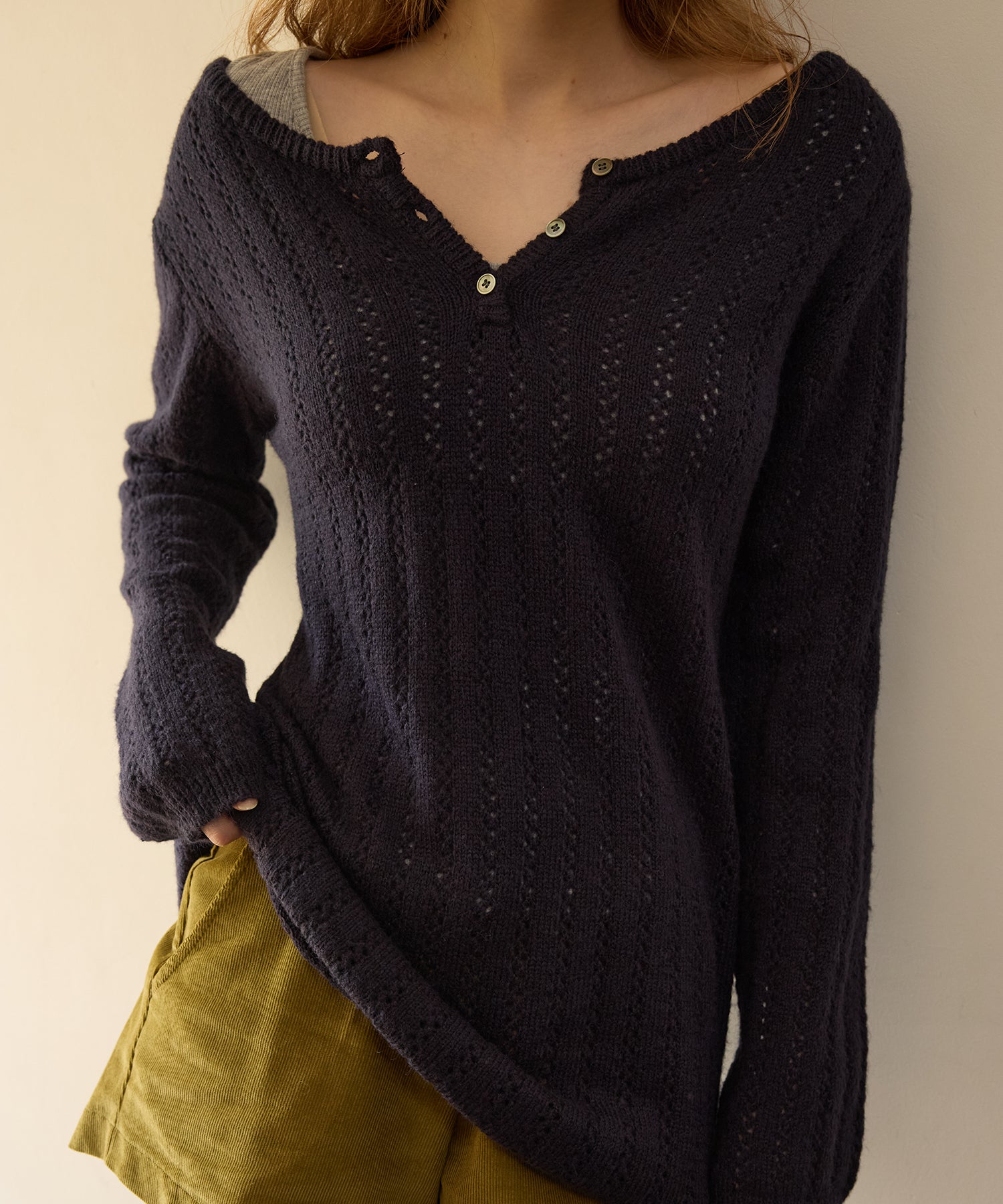 デコルテをすっきり見せるネックラインに、パンチング調の編み地によるほのかな透け感が加わり、軽やかでエレガントな雰囲気を演出します。