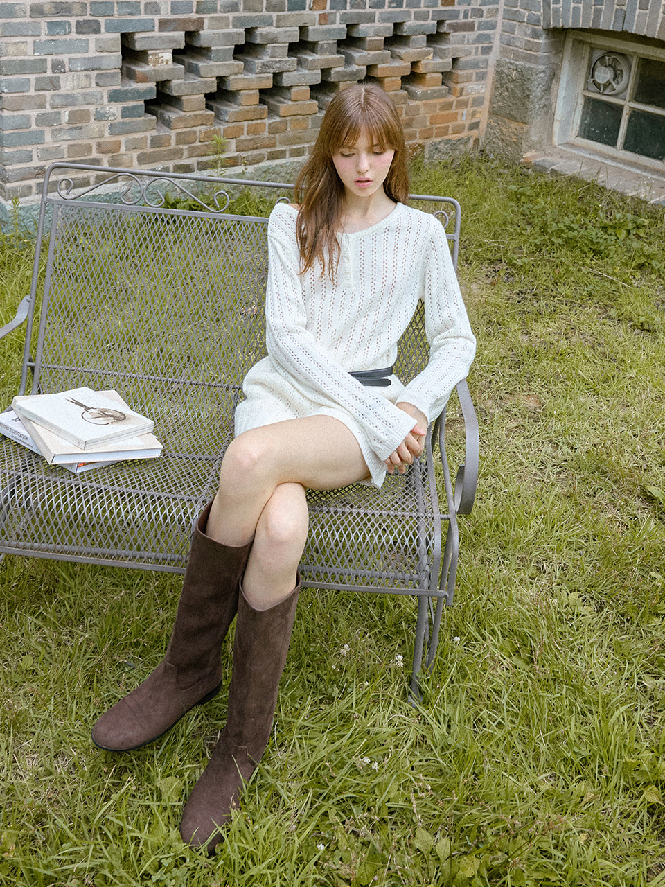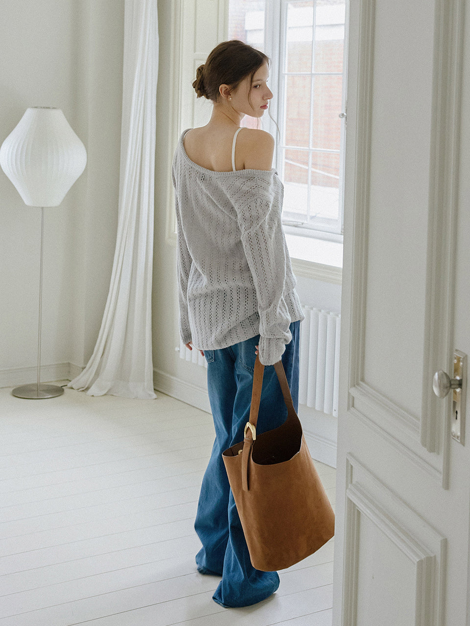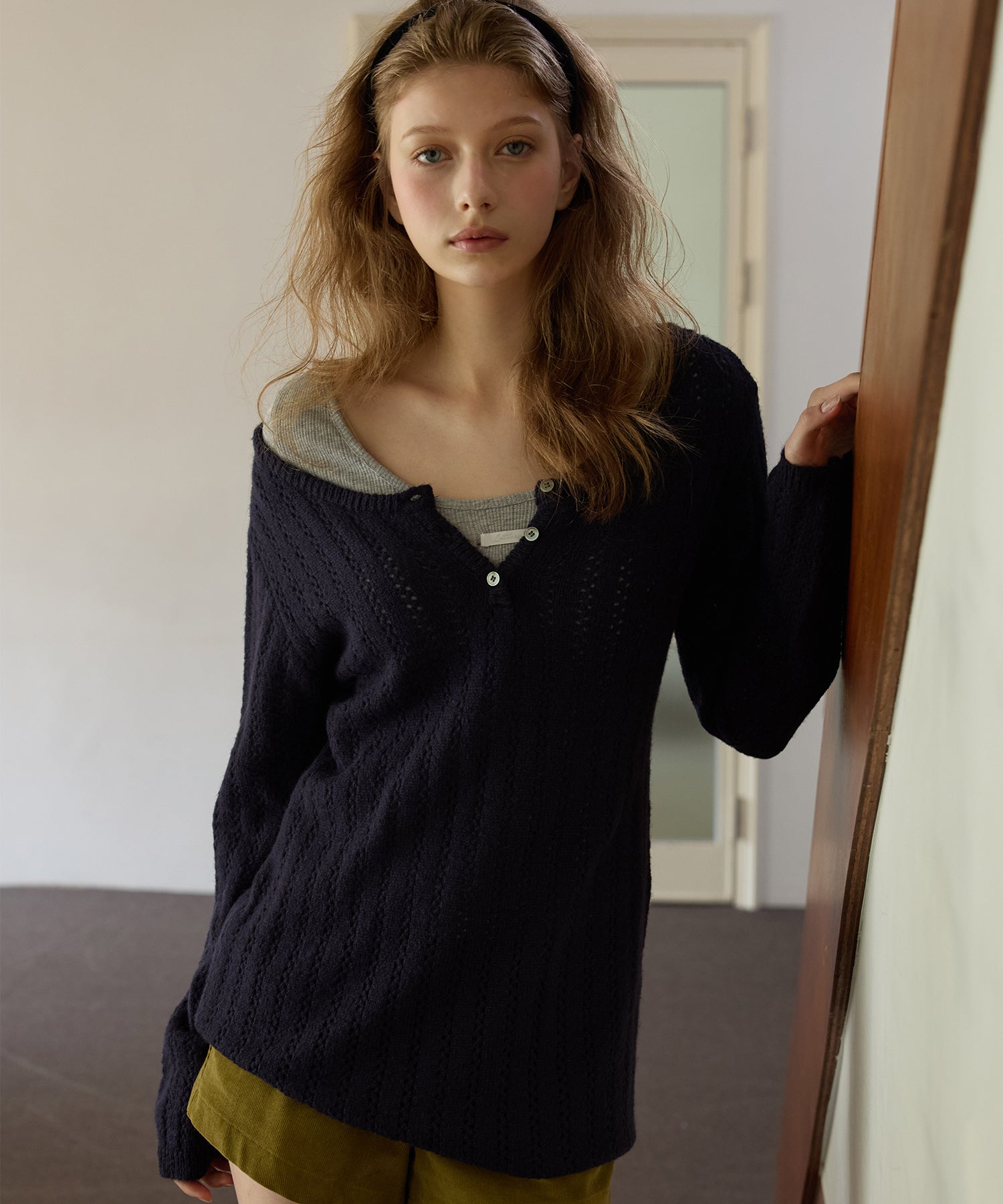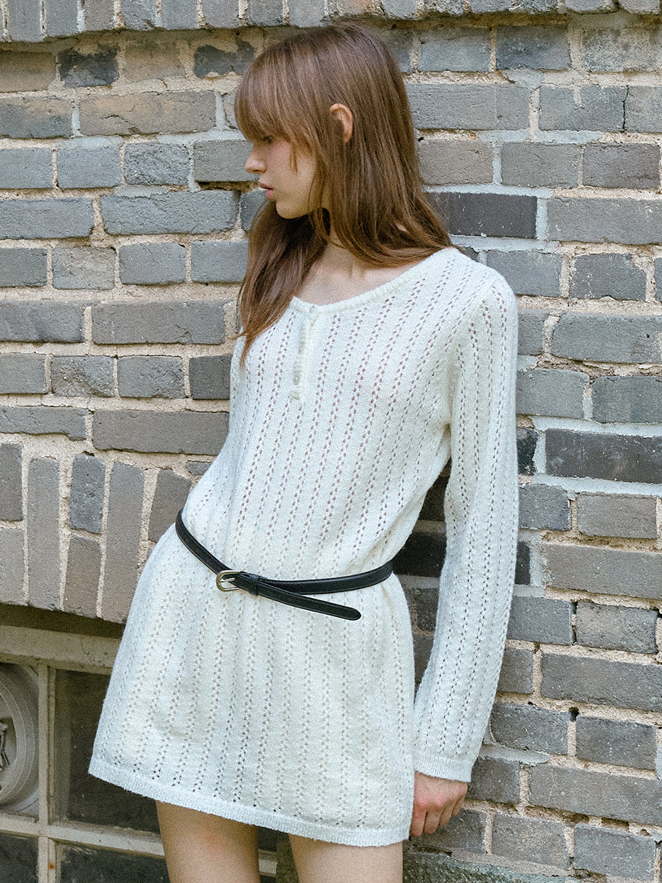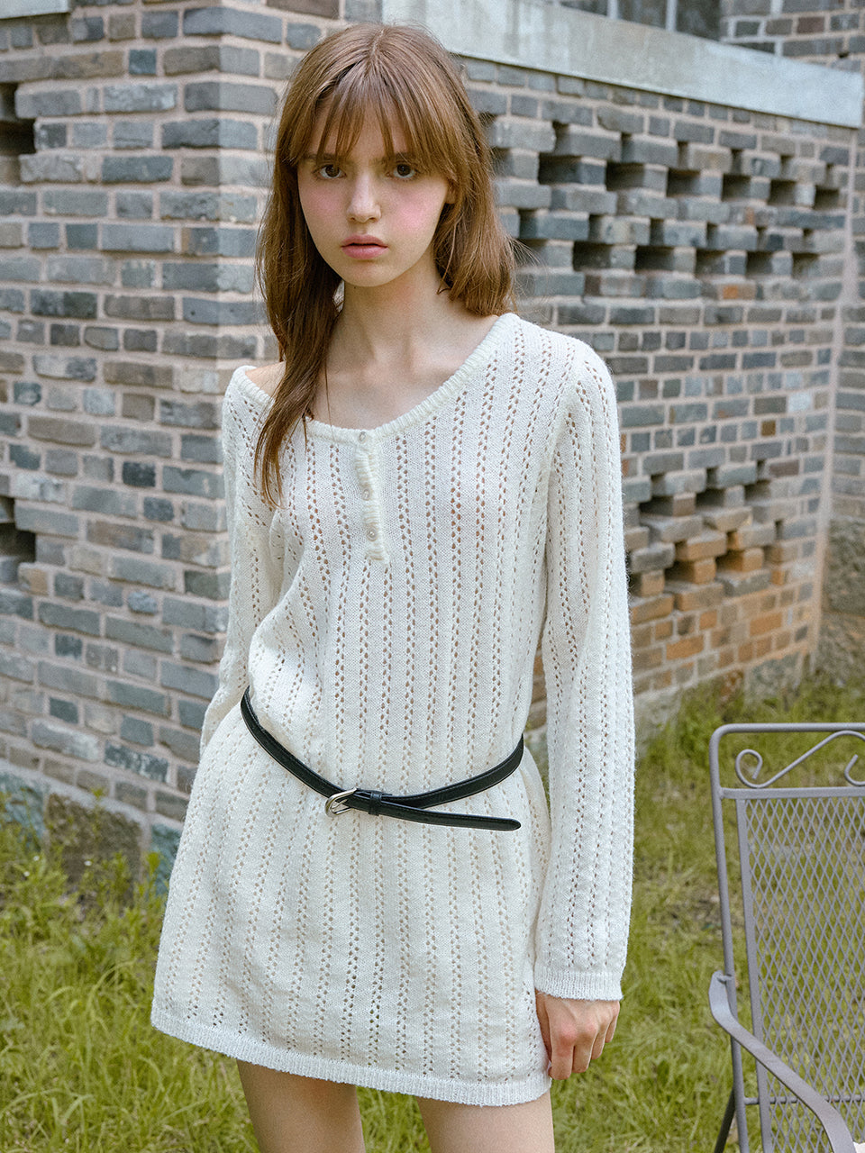 デコルテをすっきり見せるネックラインに、パンチング調の編み地によるほのかな透け感が加わり、軽やかでエレガントな雰囲気を演出します。