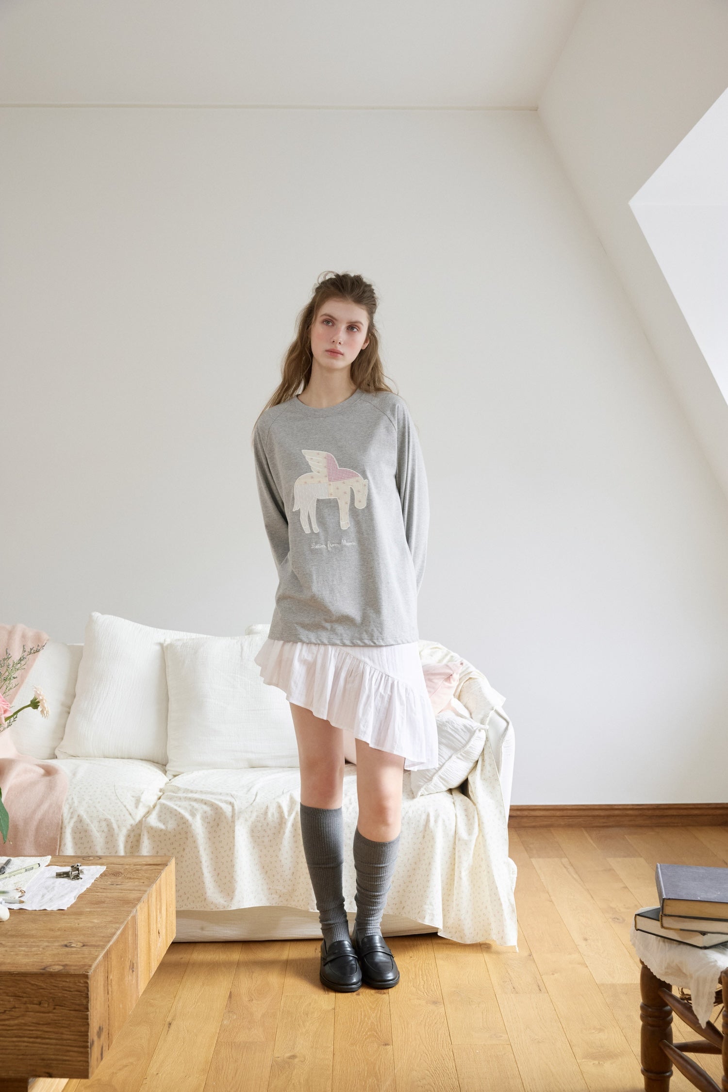 斜めの切り替えラインに沿って自然なギャザーを寄せ、裾にフリルを形成。女性らしく感度の高いシルエットを演出します。