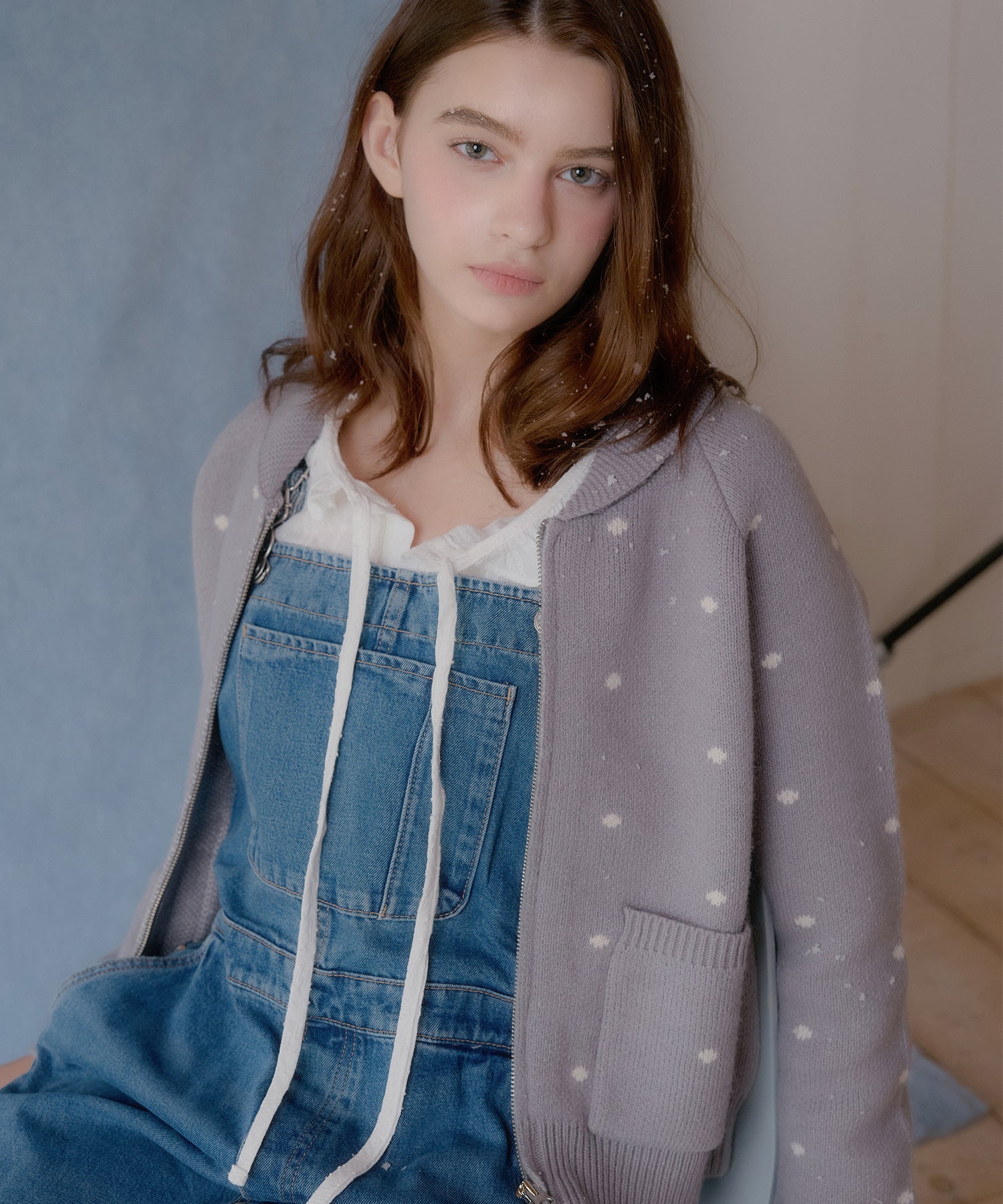 繊細なドット柄と襟のディテールが目を引くニットジップアップです。