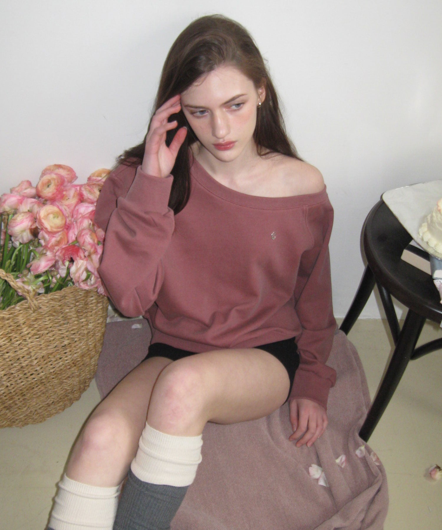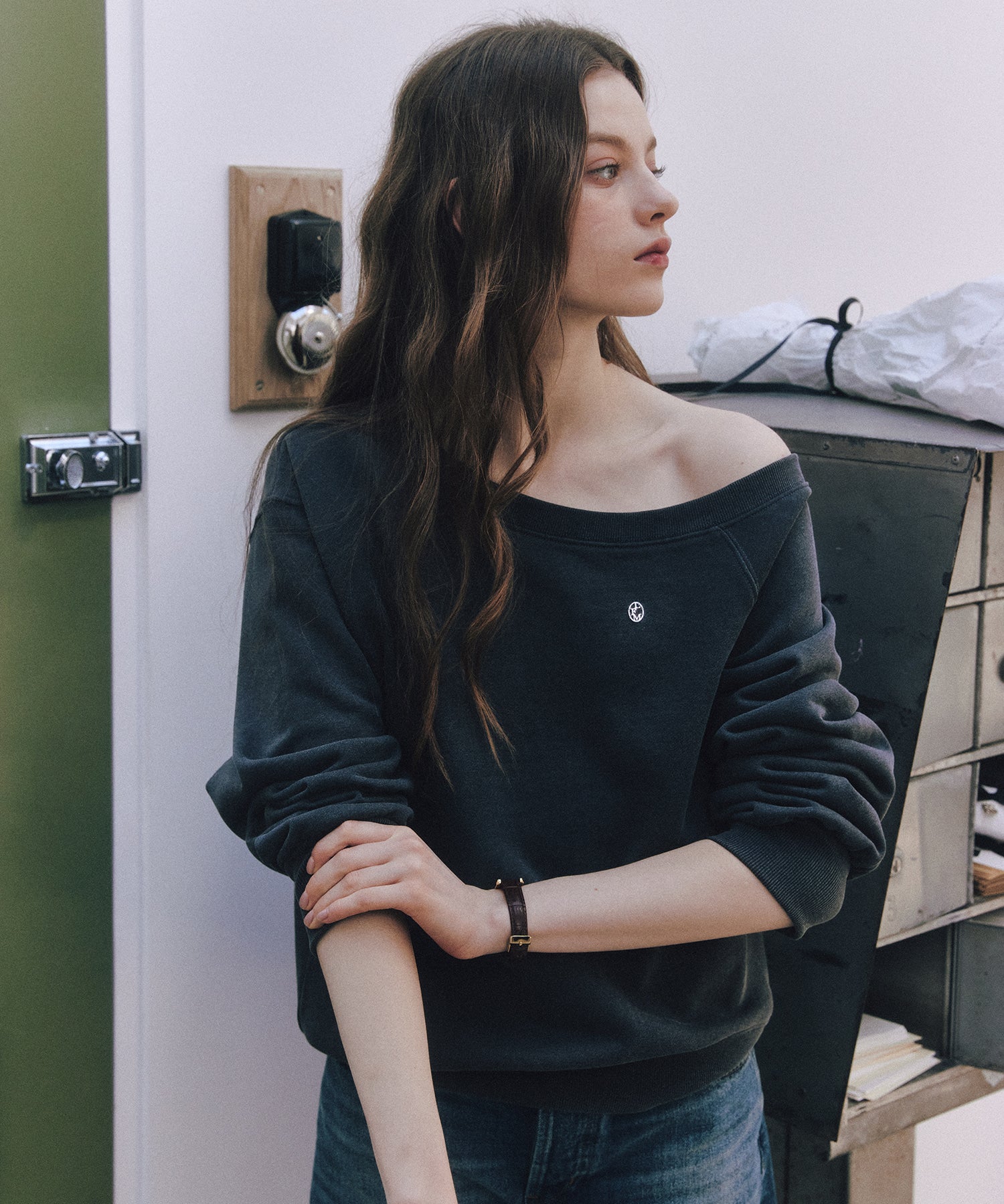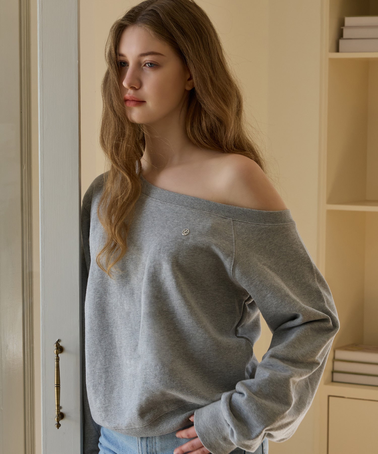 オフショルダー仕様のスウェットで、フロントにゴールド/シルバーディテールをあしらいアクセントを加えました。