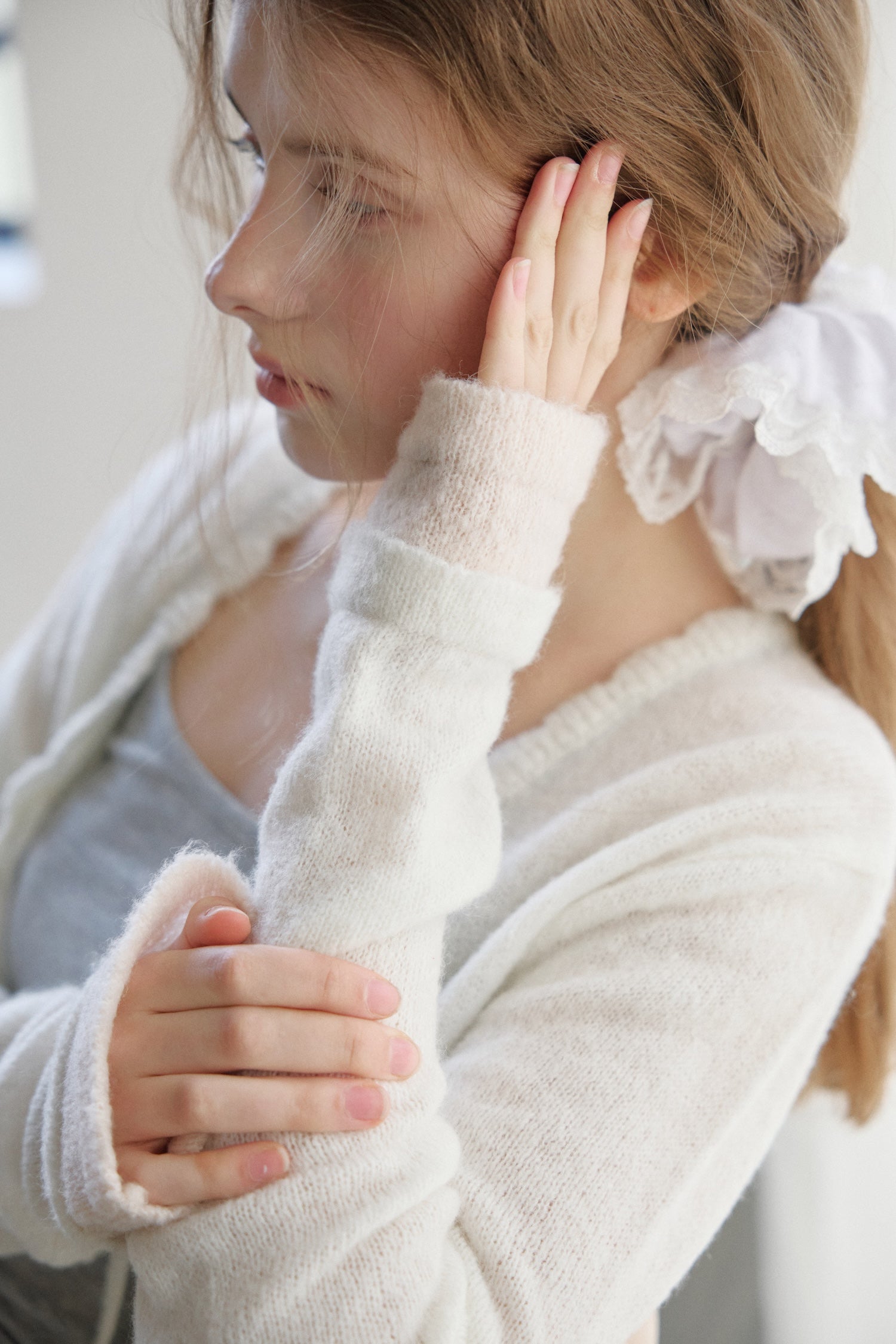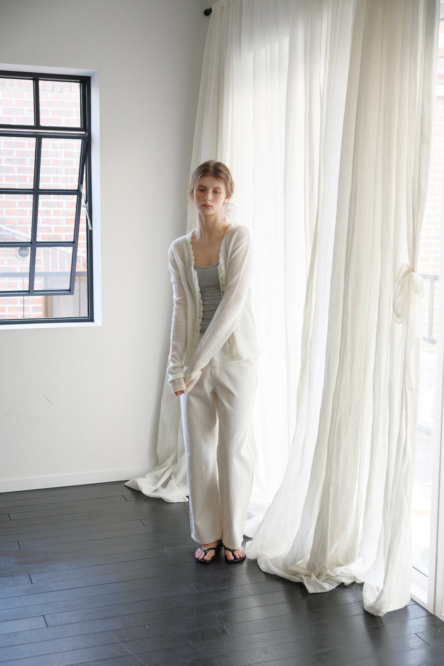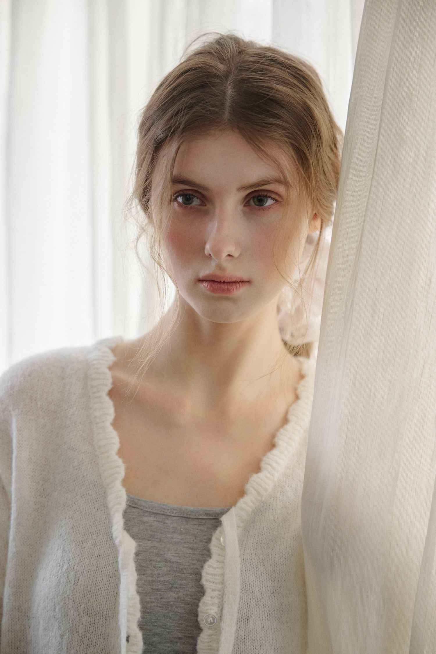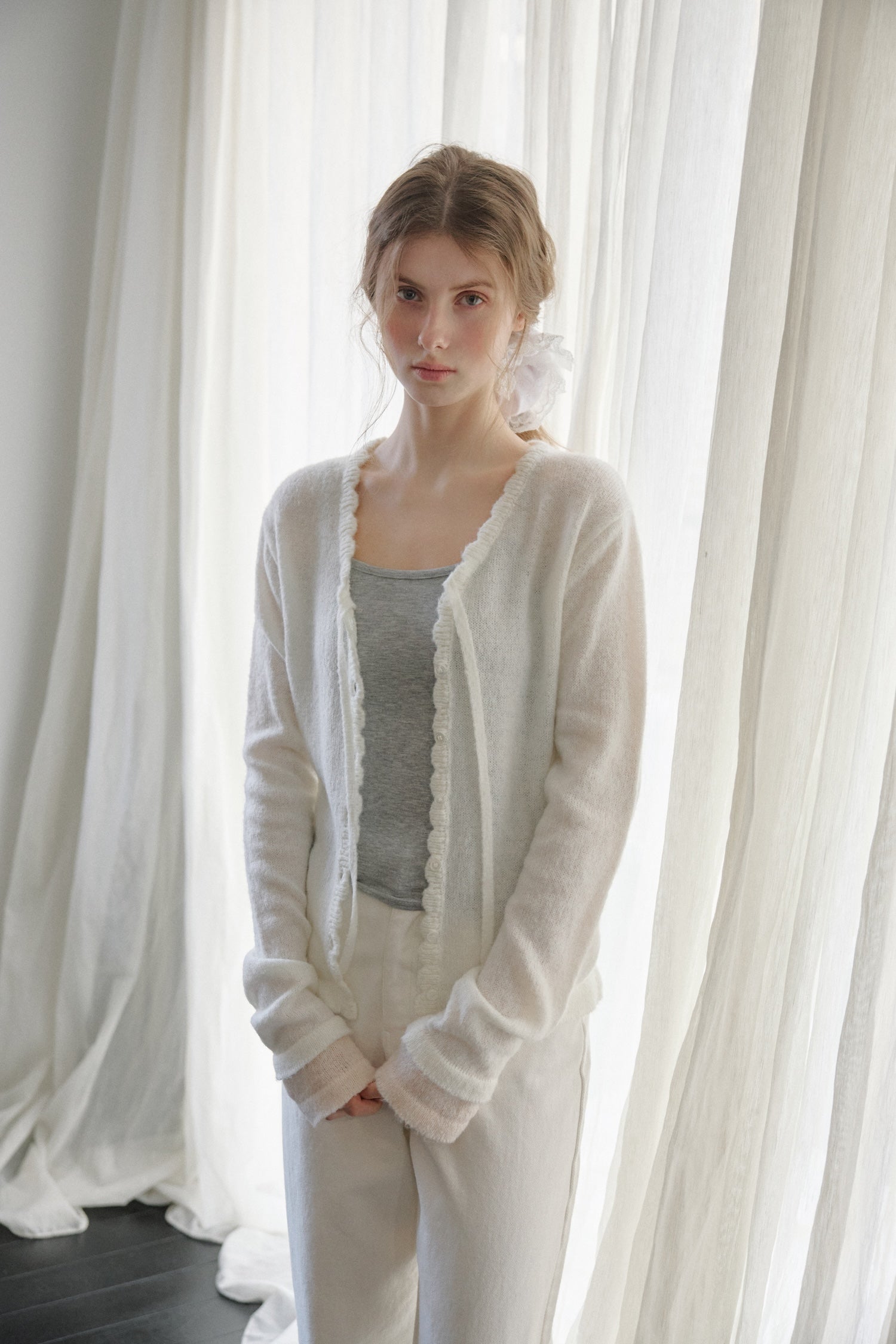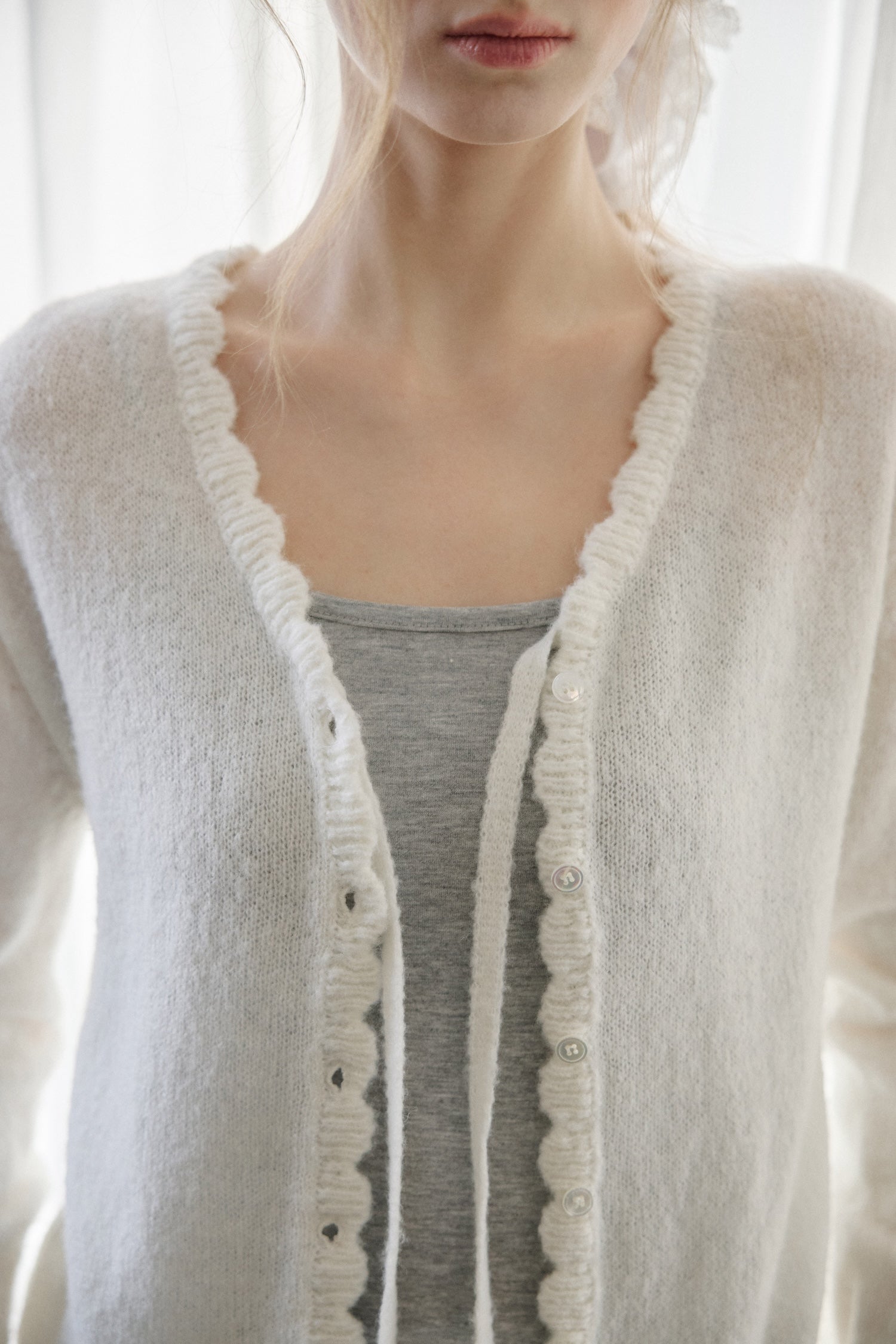 ネックラインと前立てにスカラップディテールをあしらい、繊細でフェミニンなムードを演出するカーディガンです。