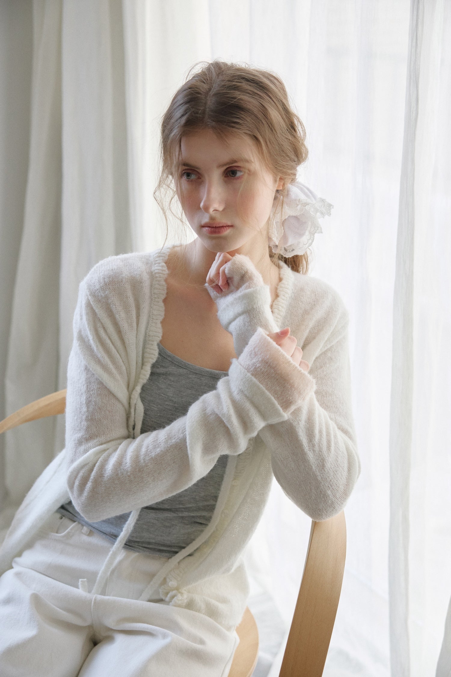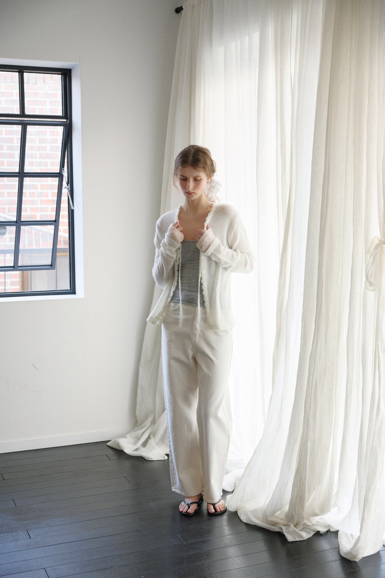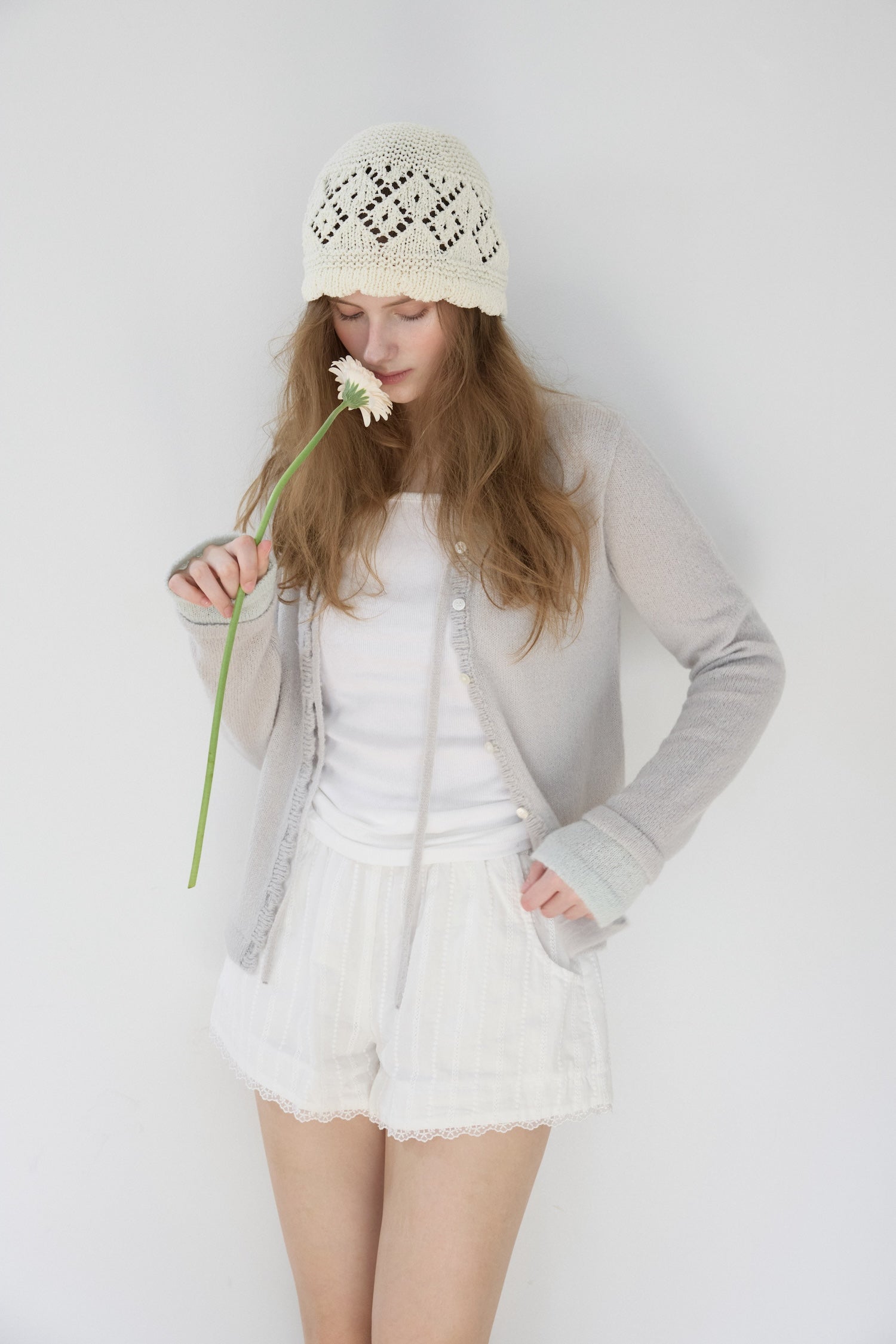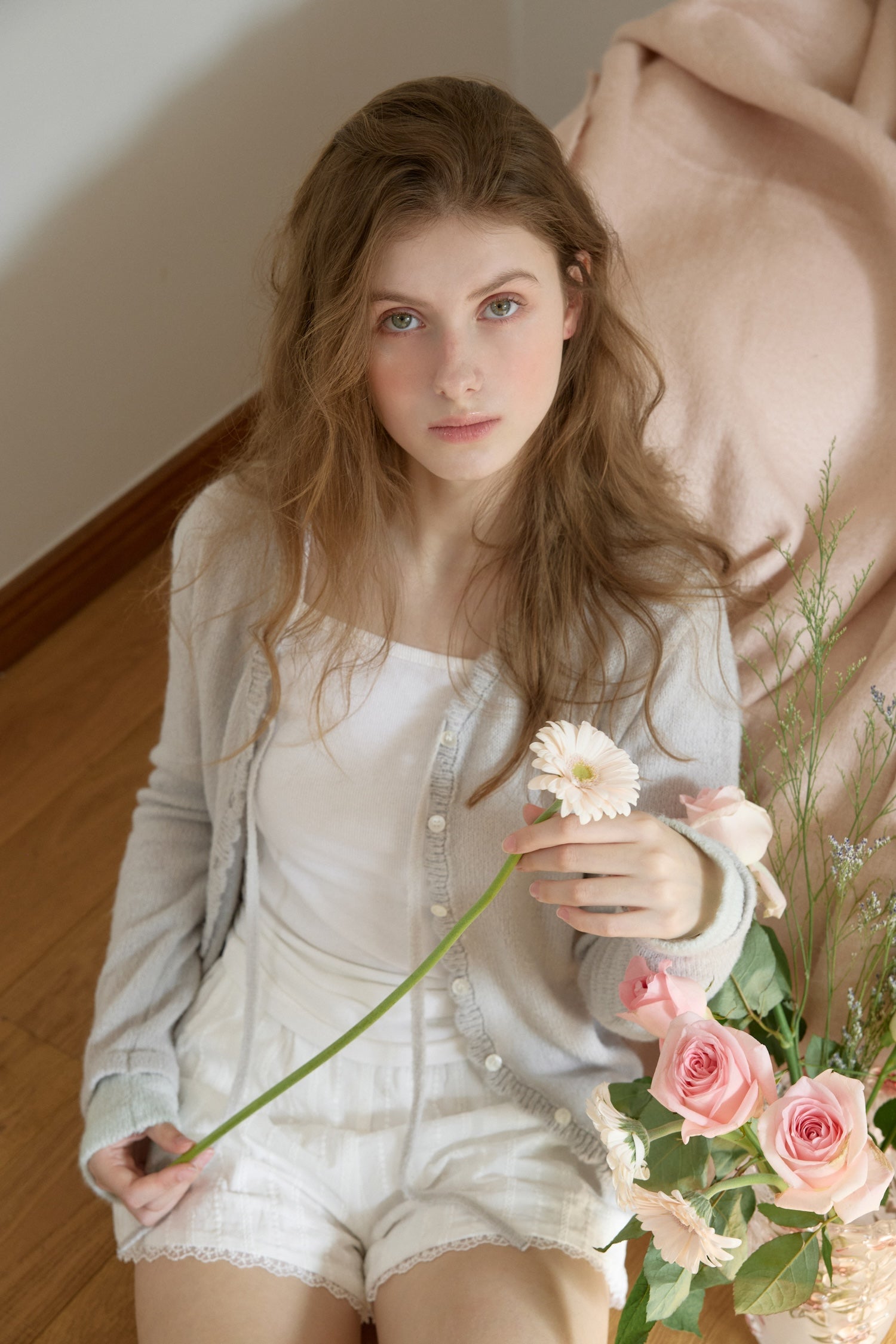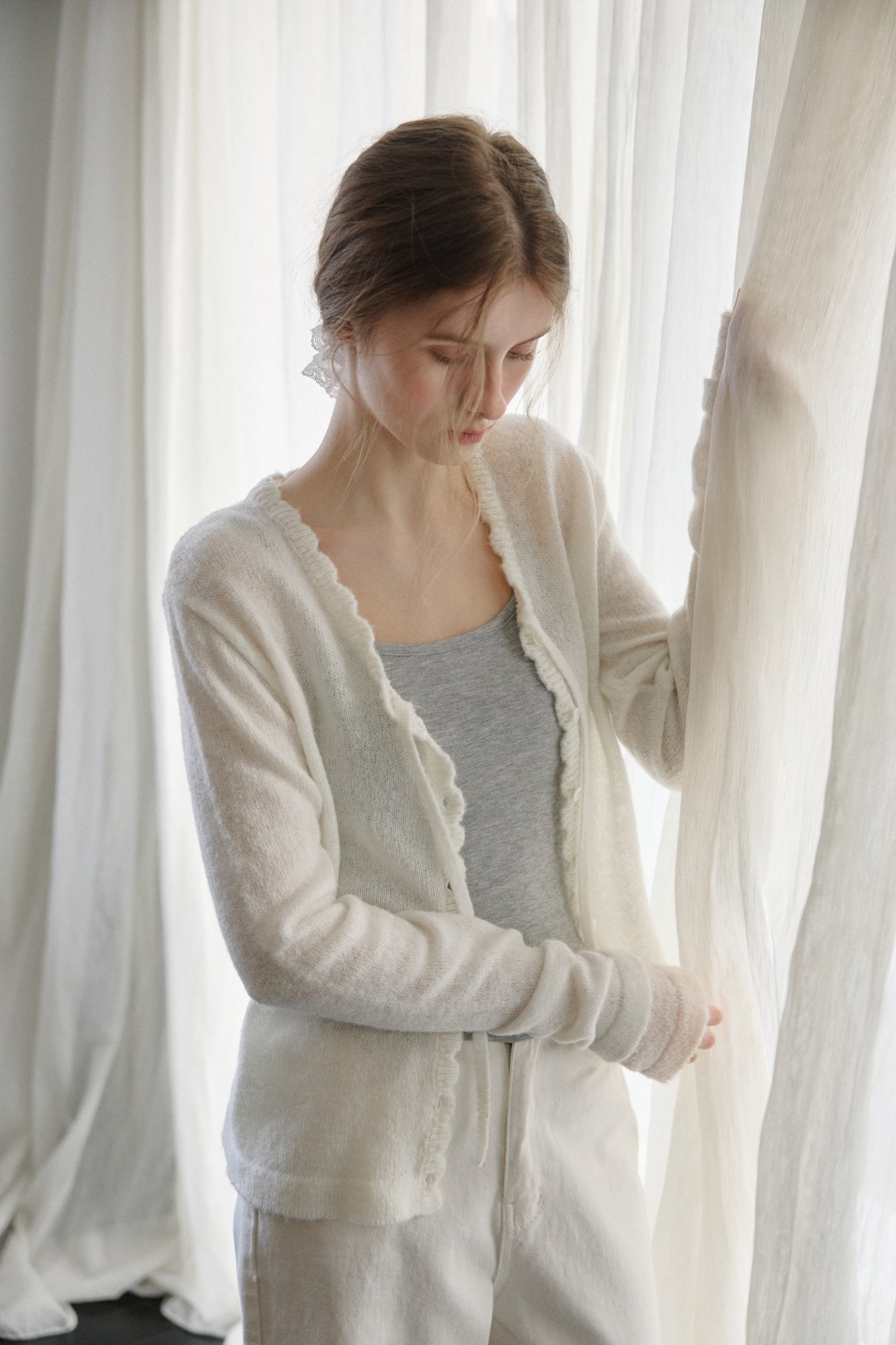 ネックラインと前立てにスカラップディテールをあしらい、繊細でフェミニンなムードを演出するカーディガンです。