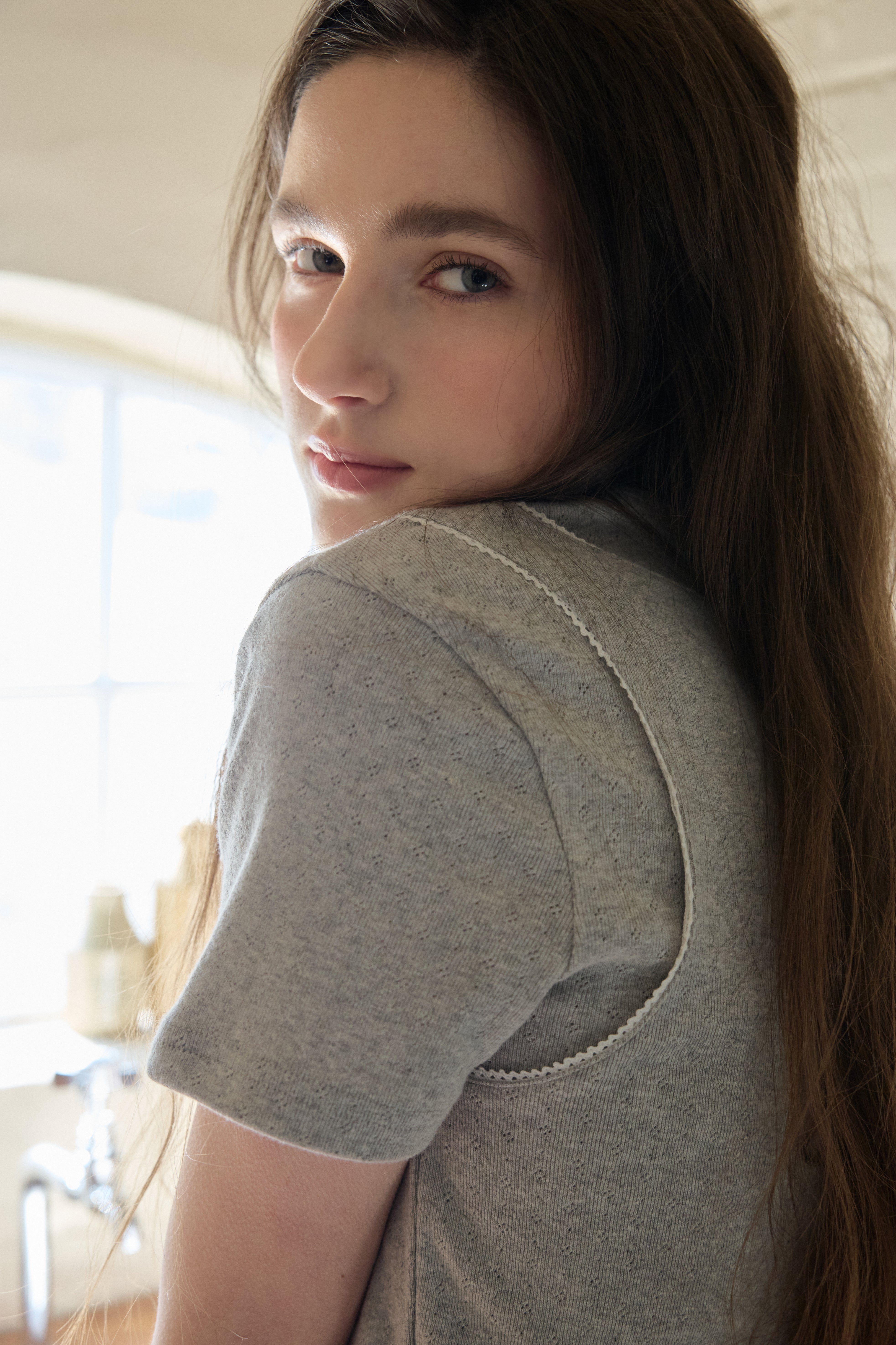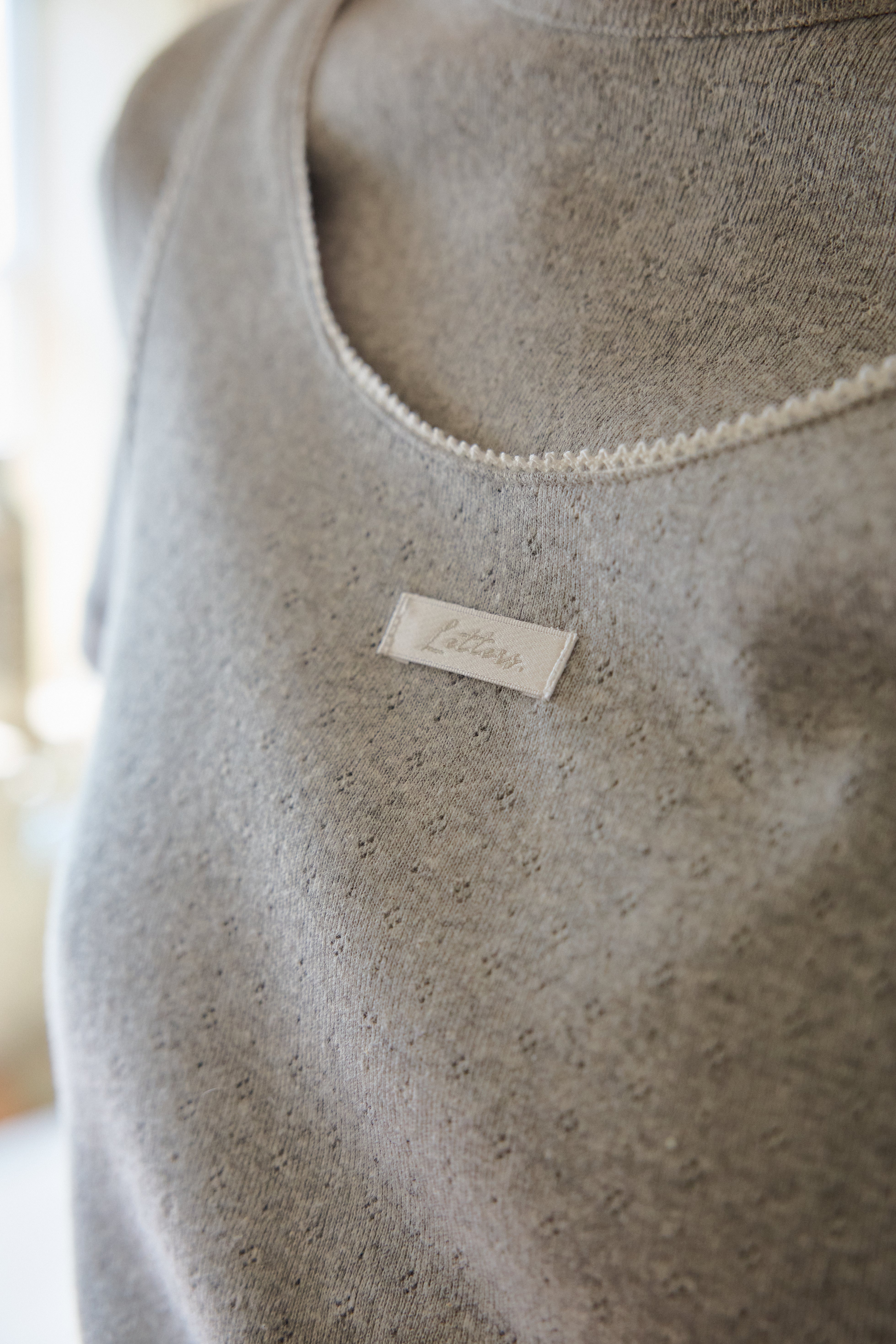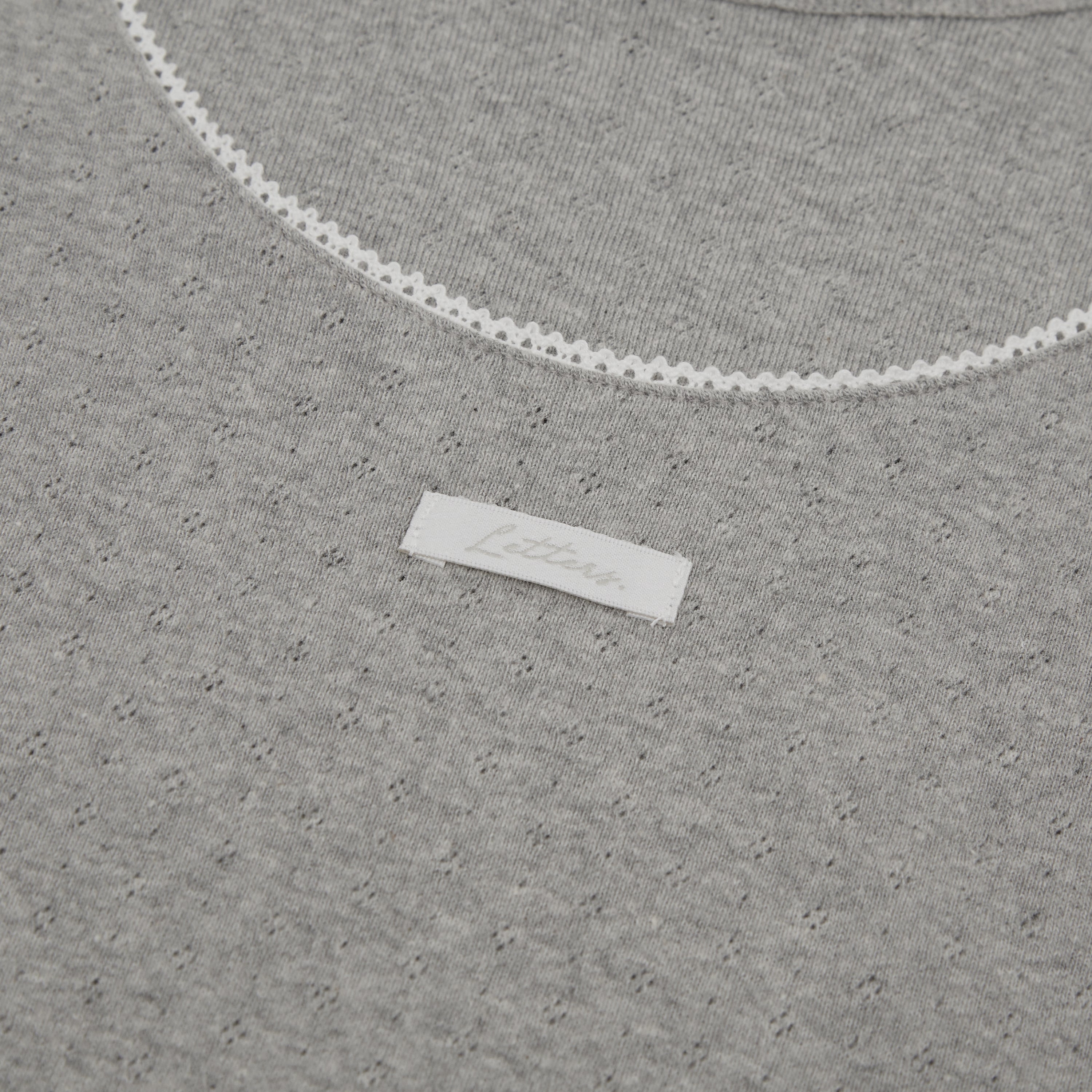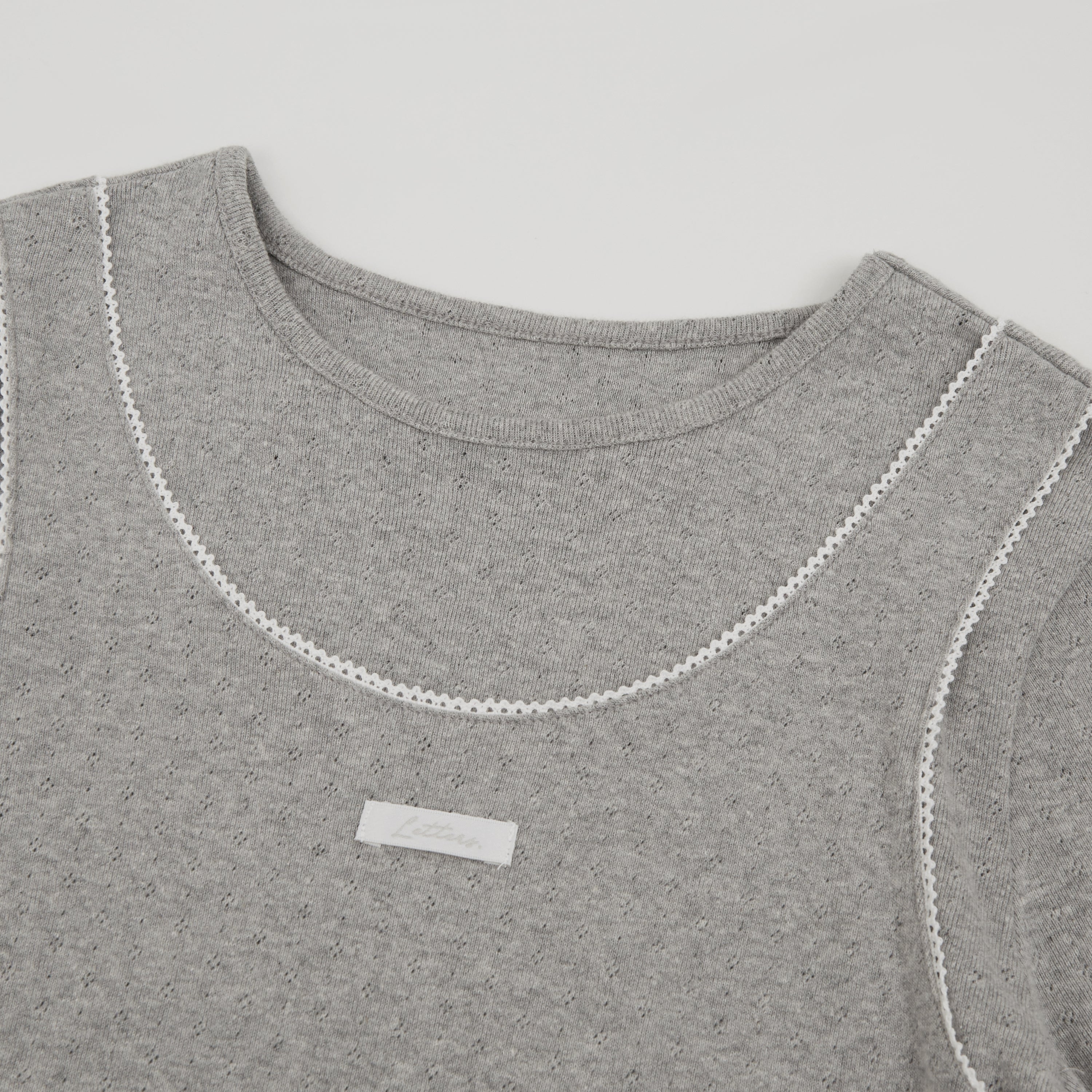 ノースリーブのネックラインとアームホールにはレースディテールを施し、さりげない女性らしさを引き立てました。