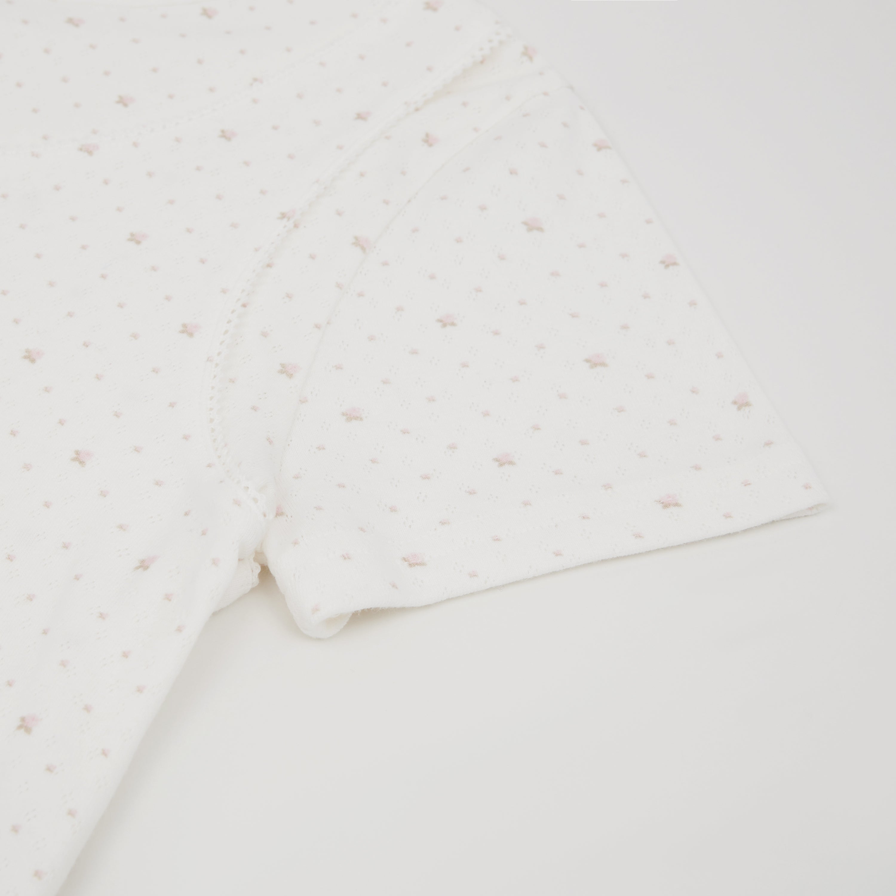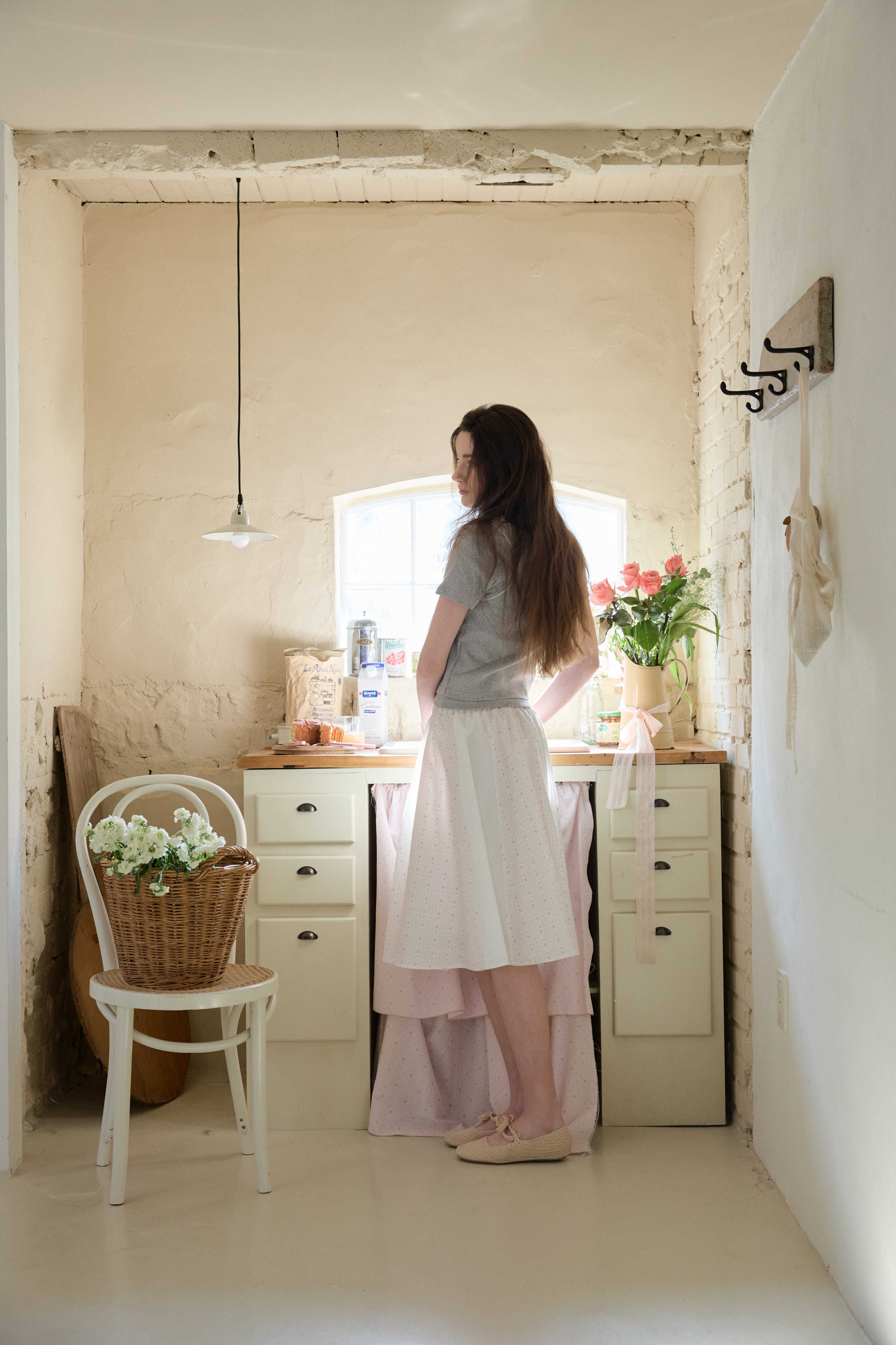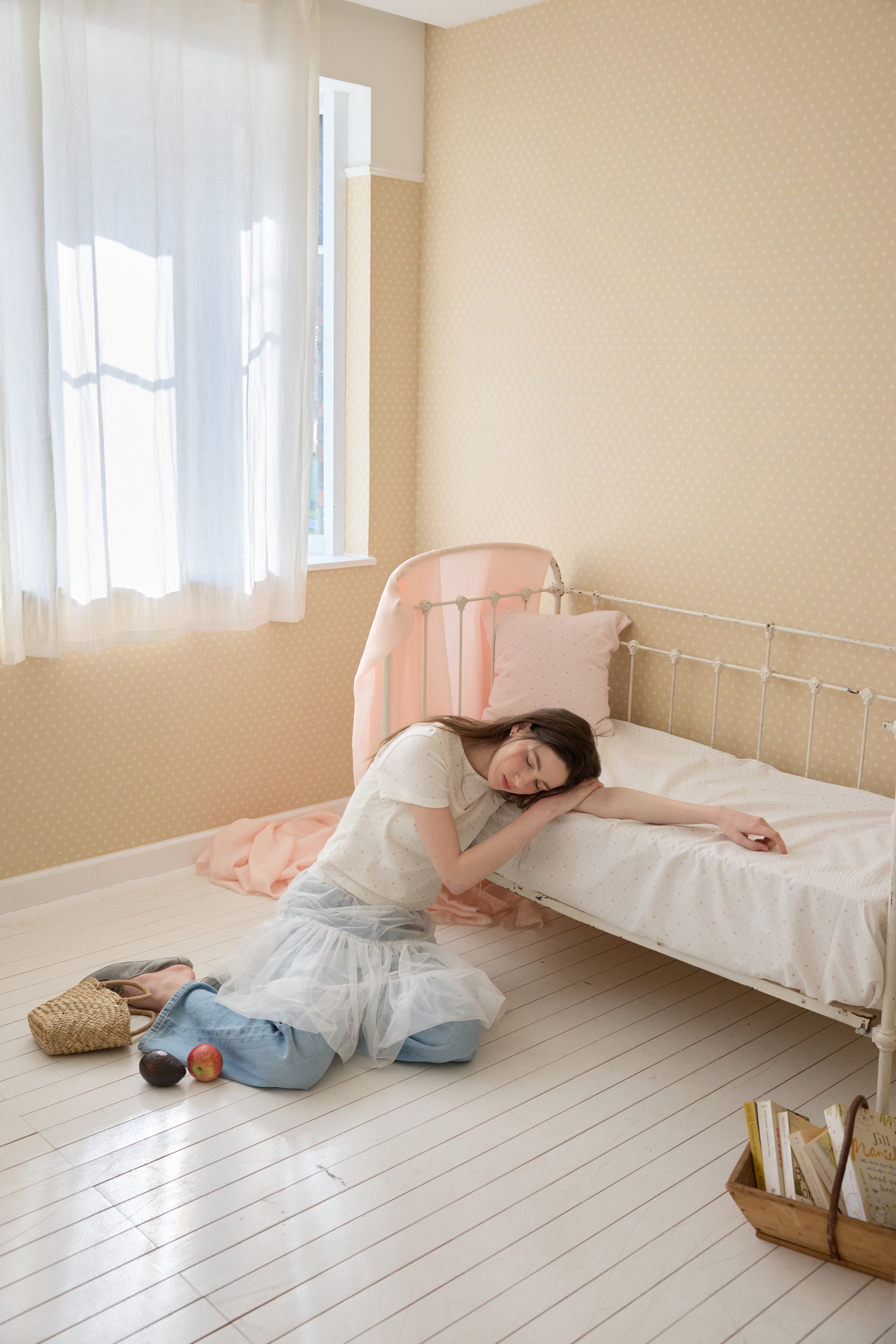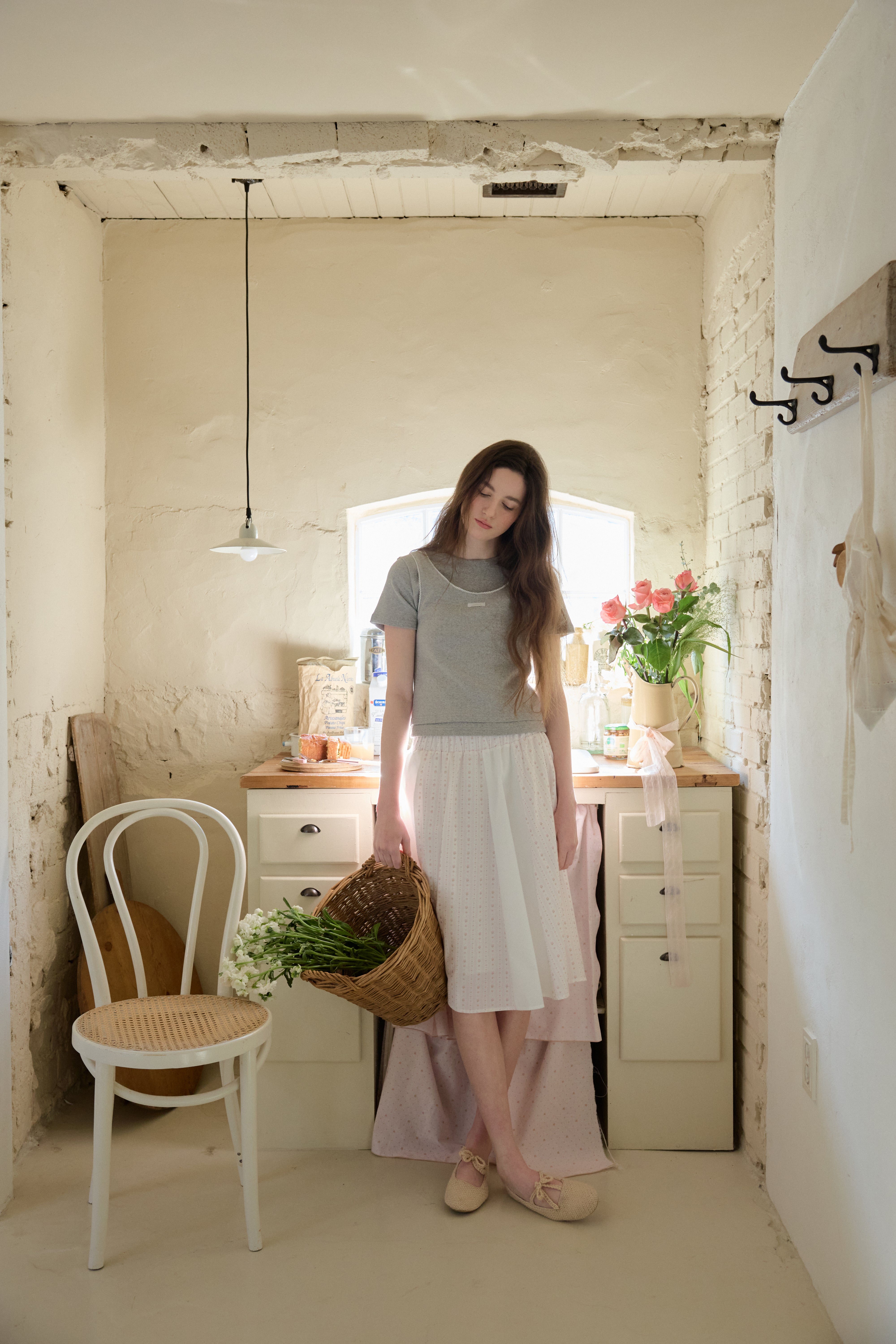 ノースリーブのネックラインとアームホールにはレースディテールを施し、さりげない女性らしさを引き立てました。