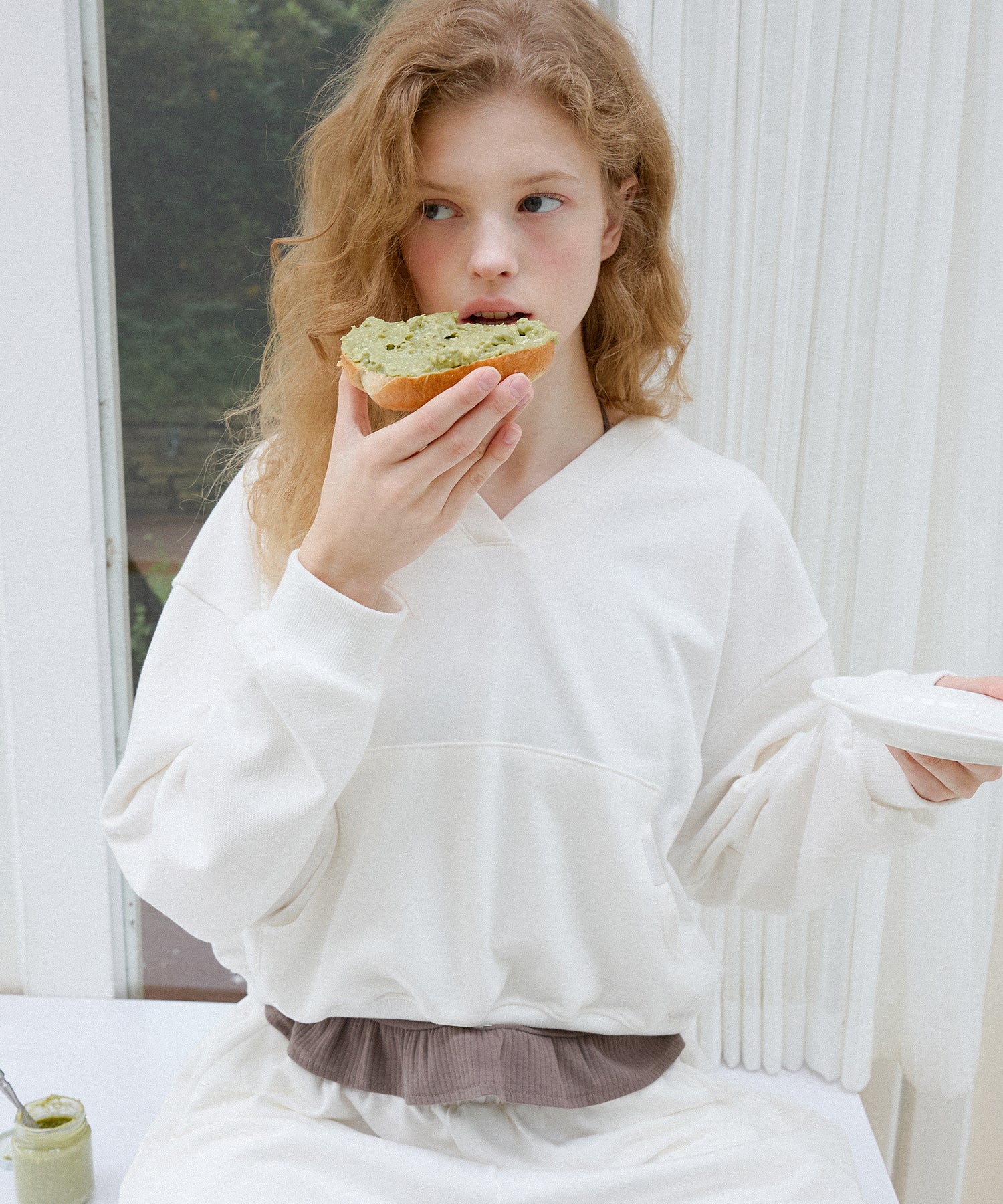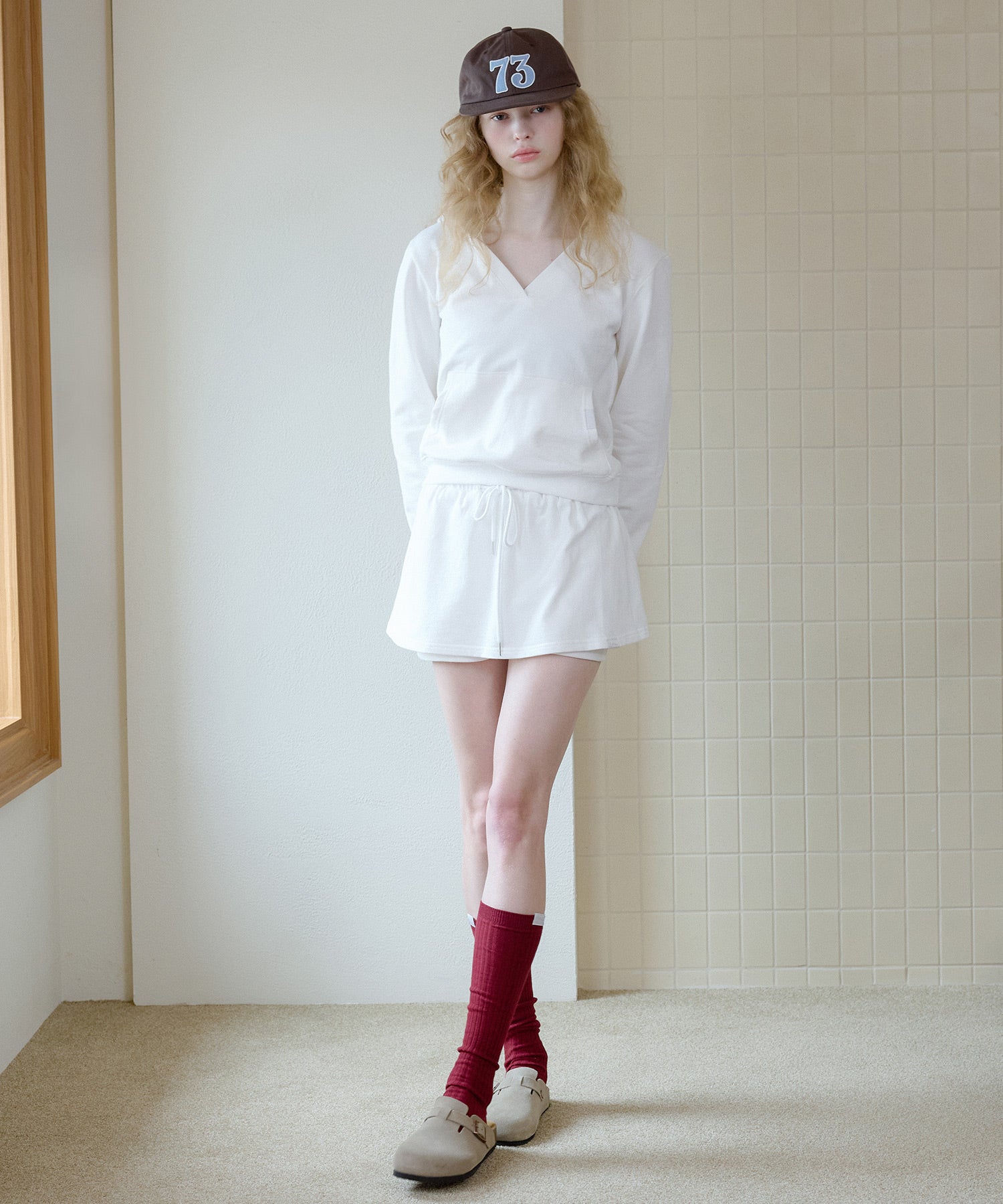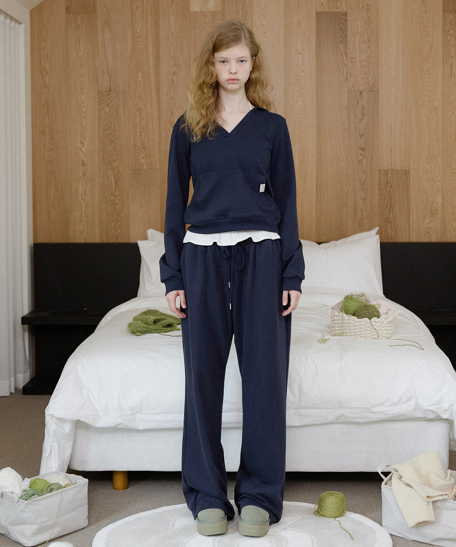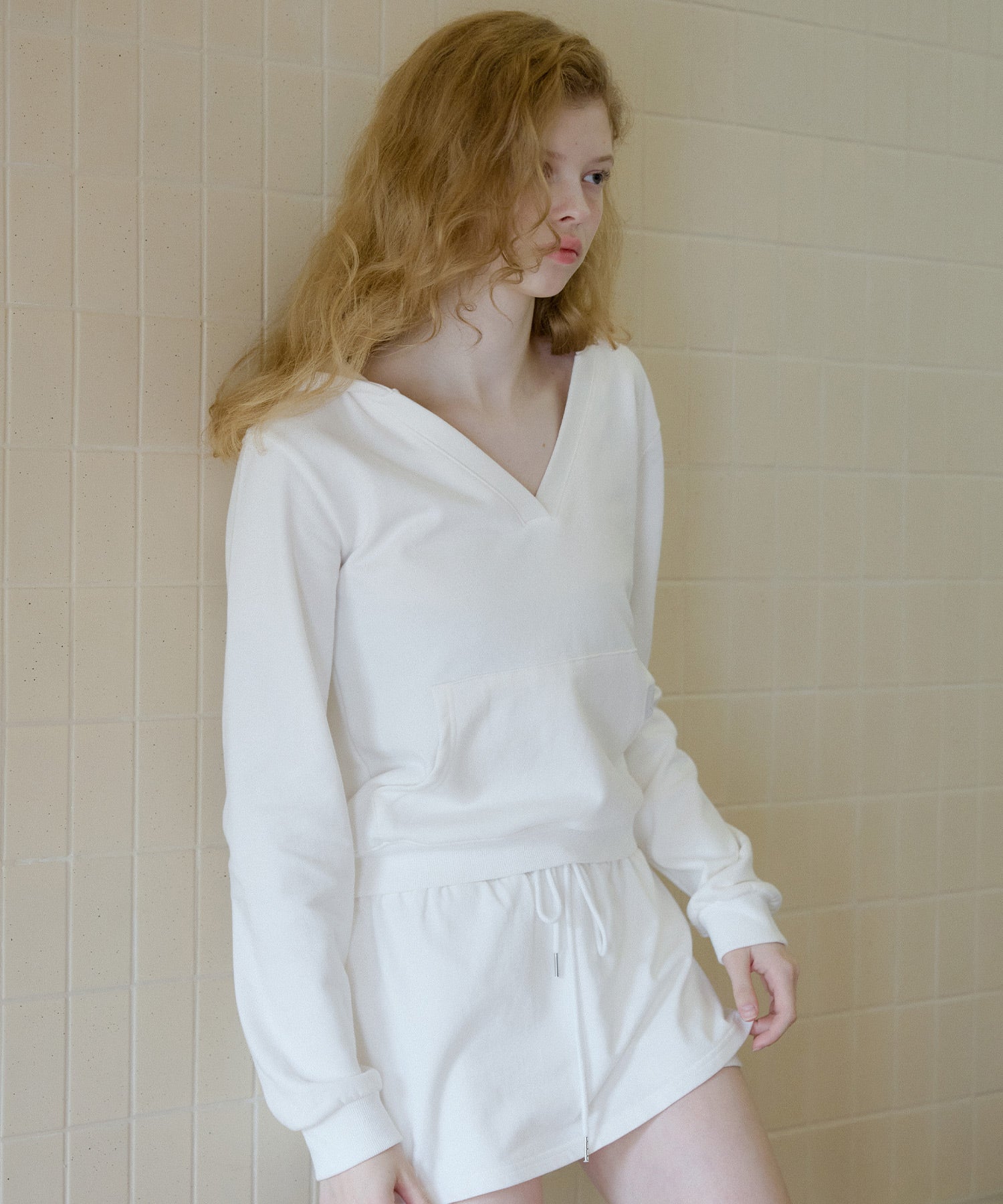 珍しいVネックフーディーデザインで、さまざまなインナーとレイヤードして個性的なコーディネートが楽しめます。
