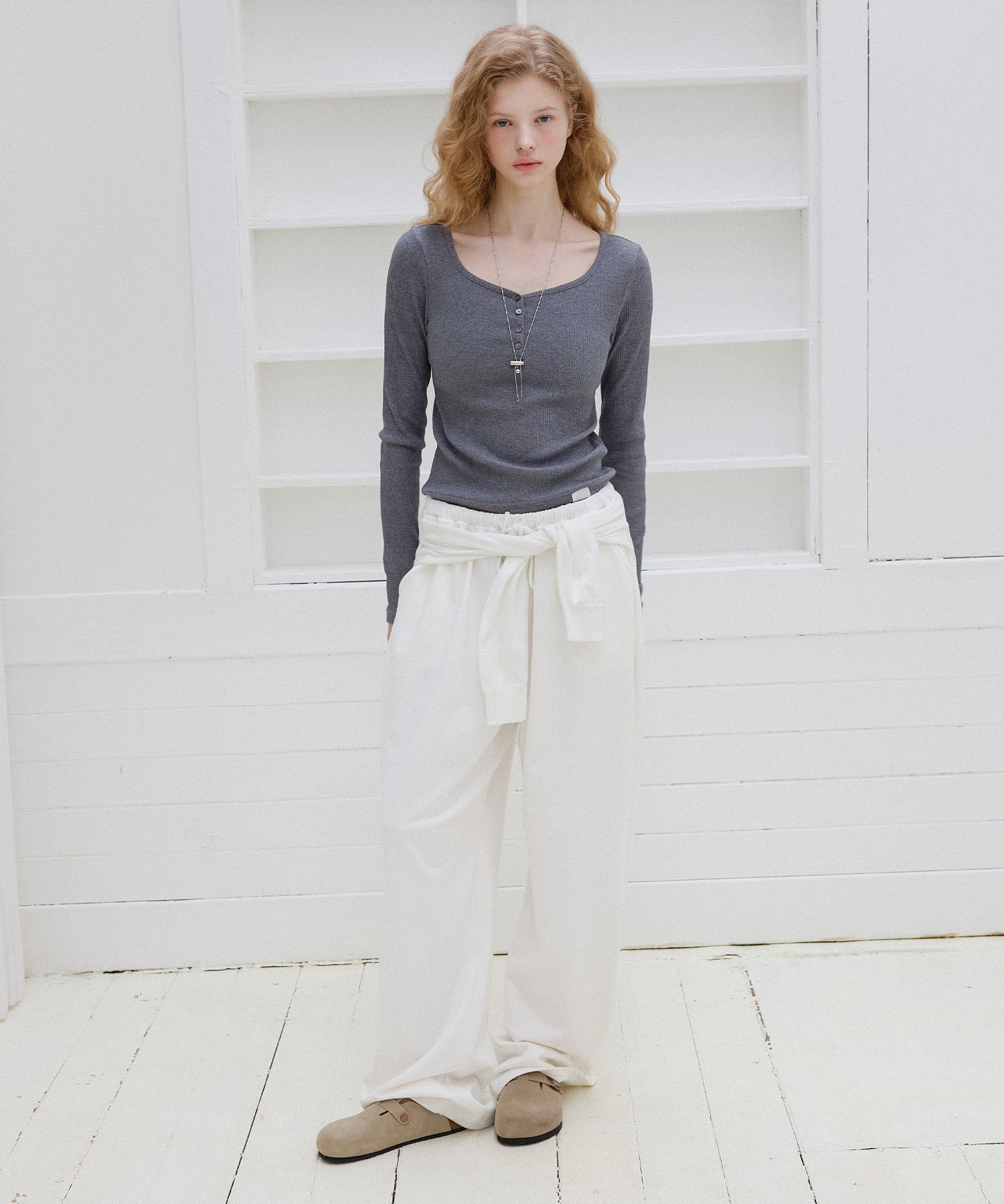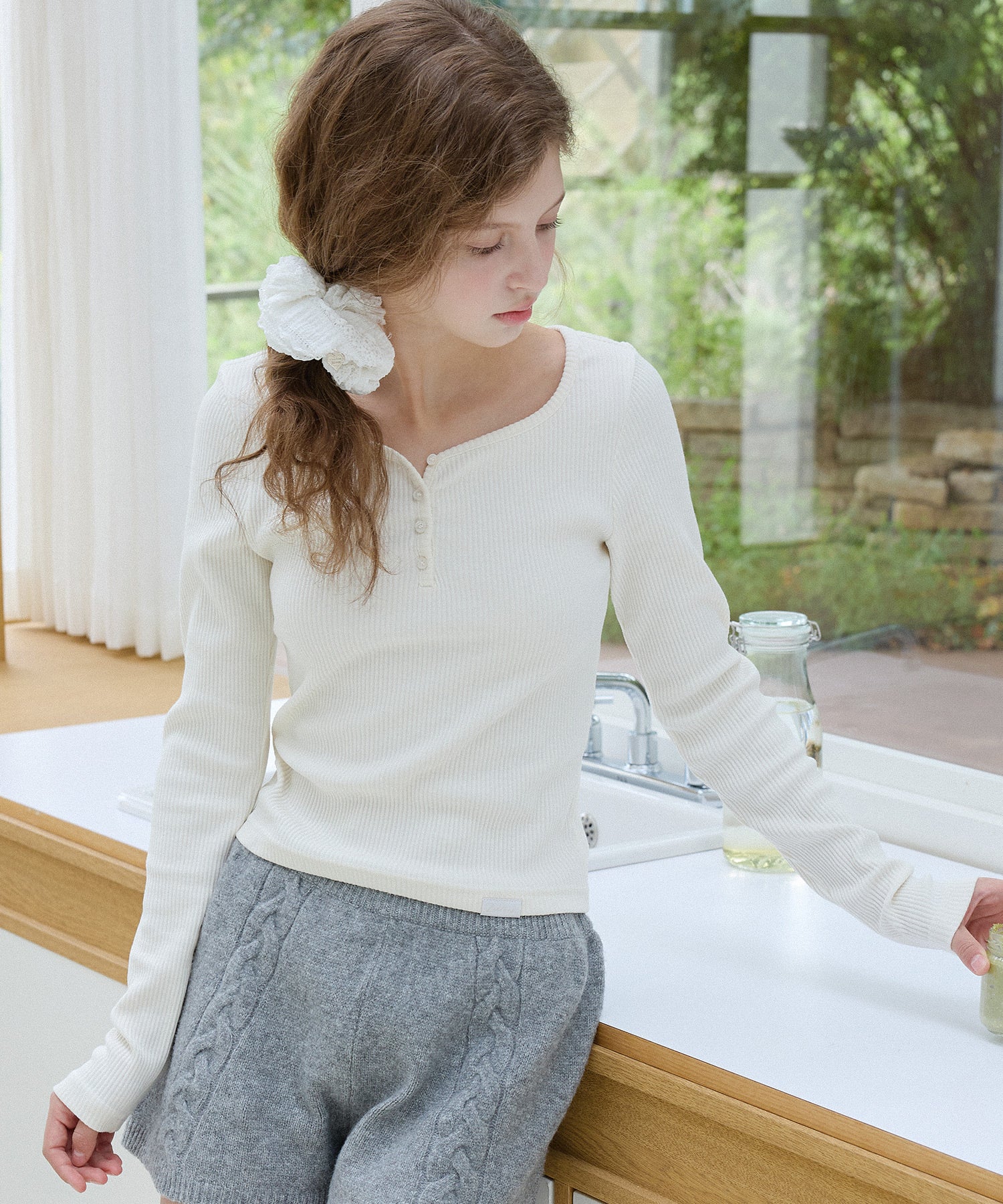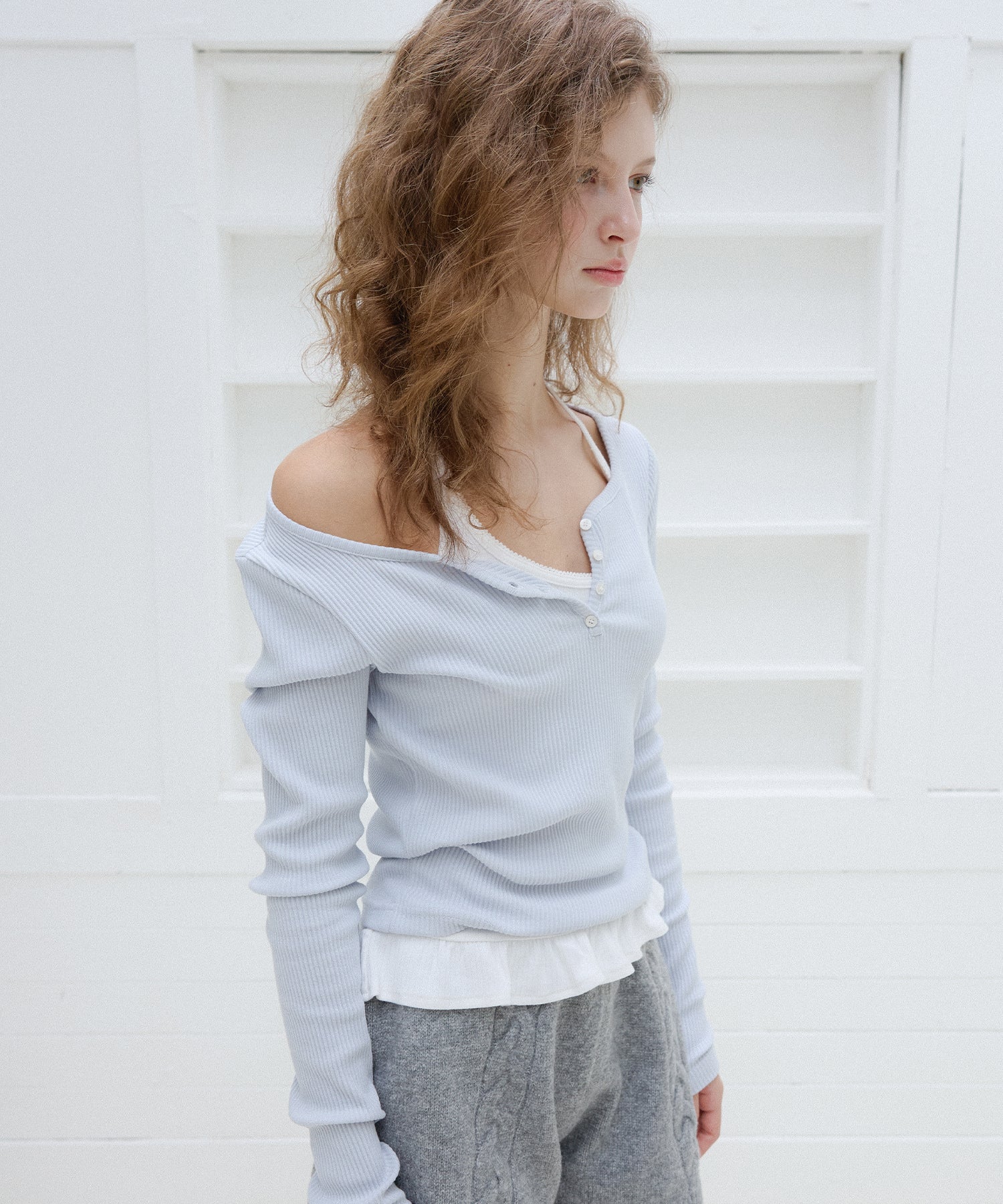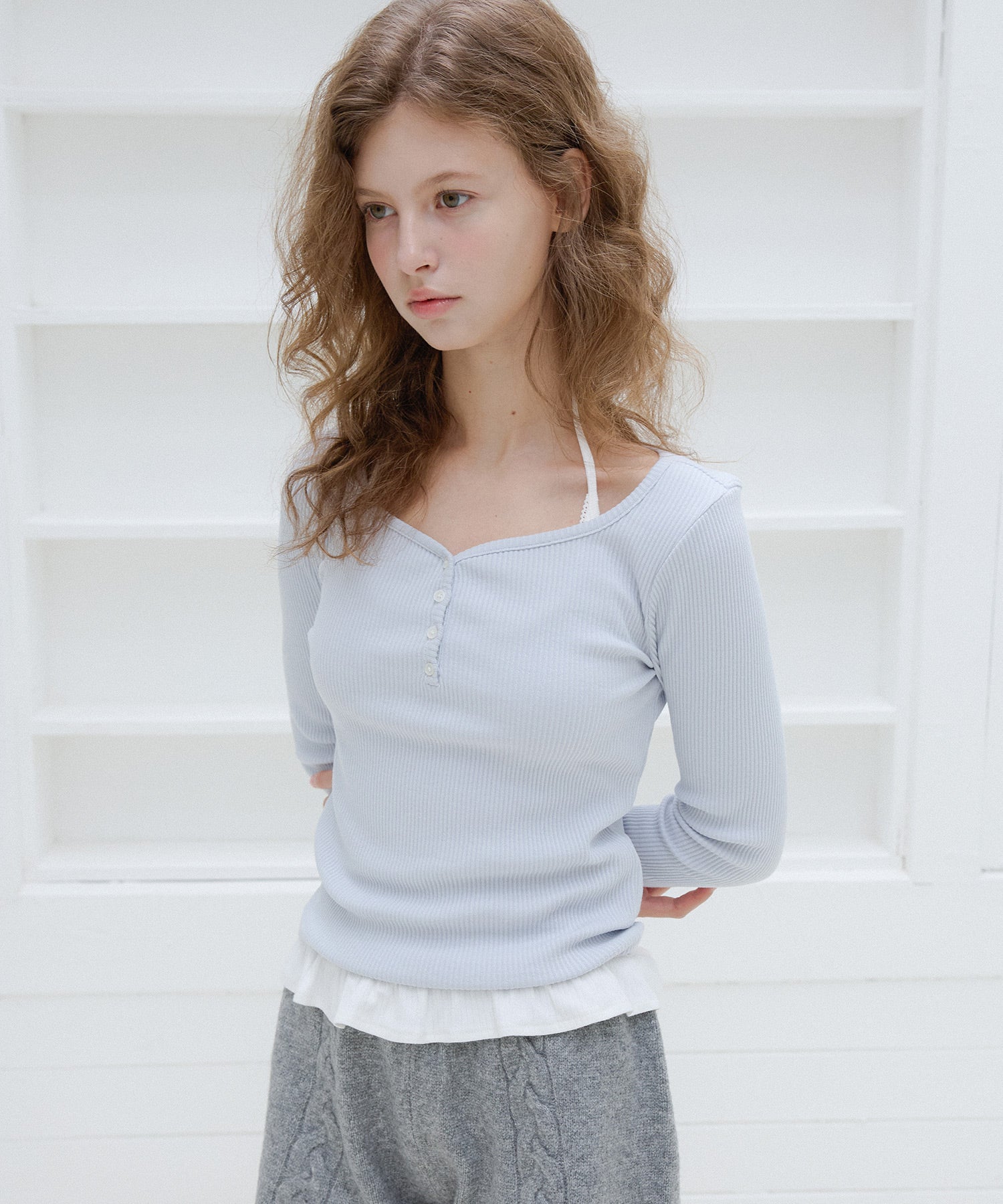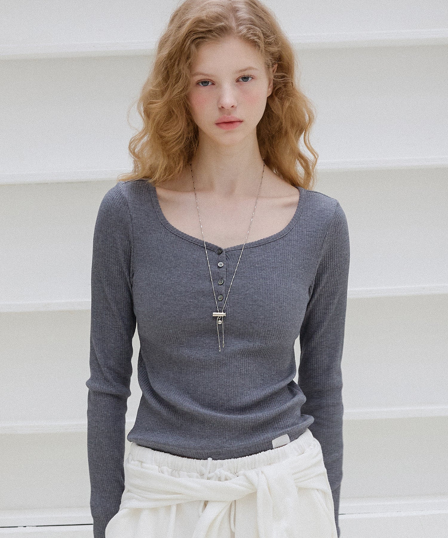 繊細なリブの質感と自然なスリムフィットシルエットが魅力のハートネックボタンTシャツです。