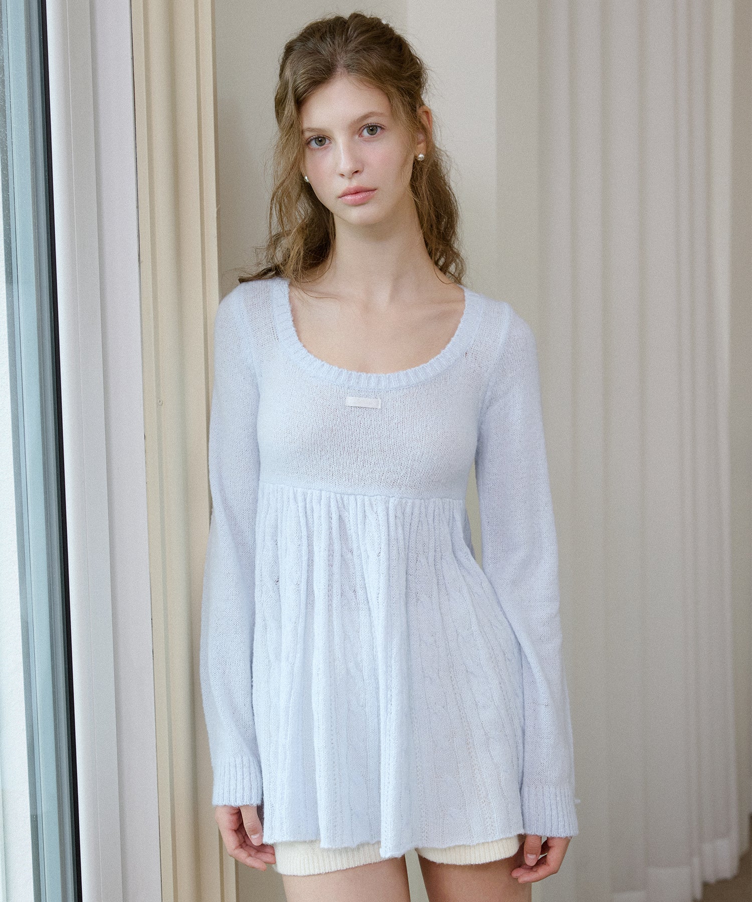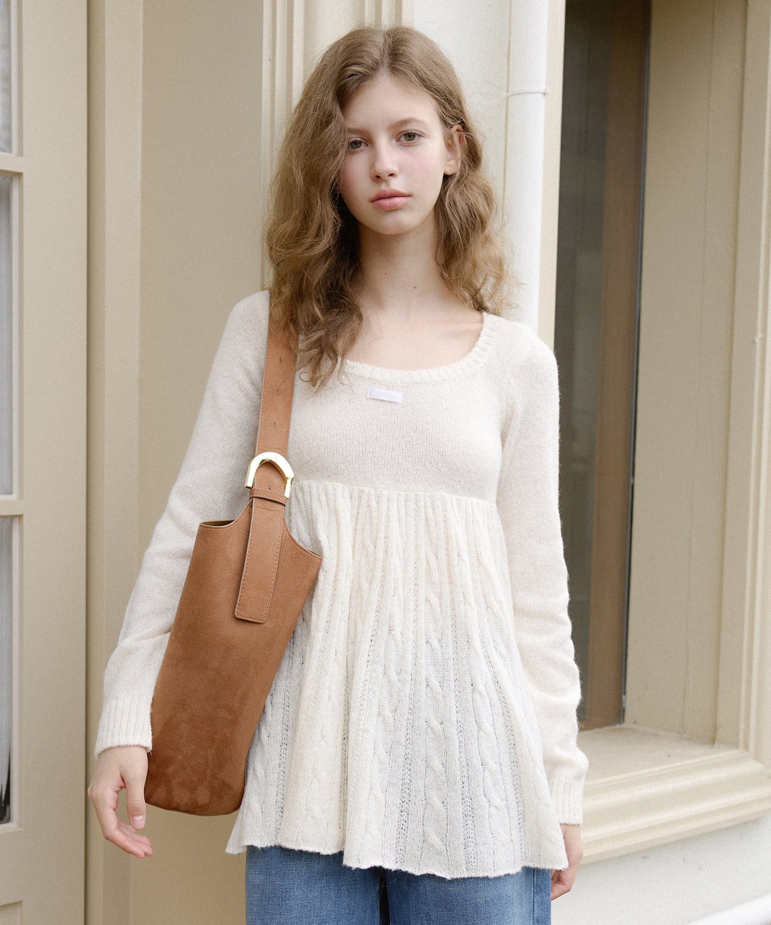 ユニークな切り替えラインとケーブル編みの表情がポイントのスクエアネックフレアニットトップです。
