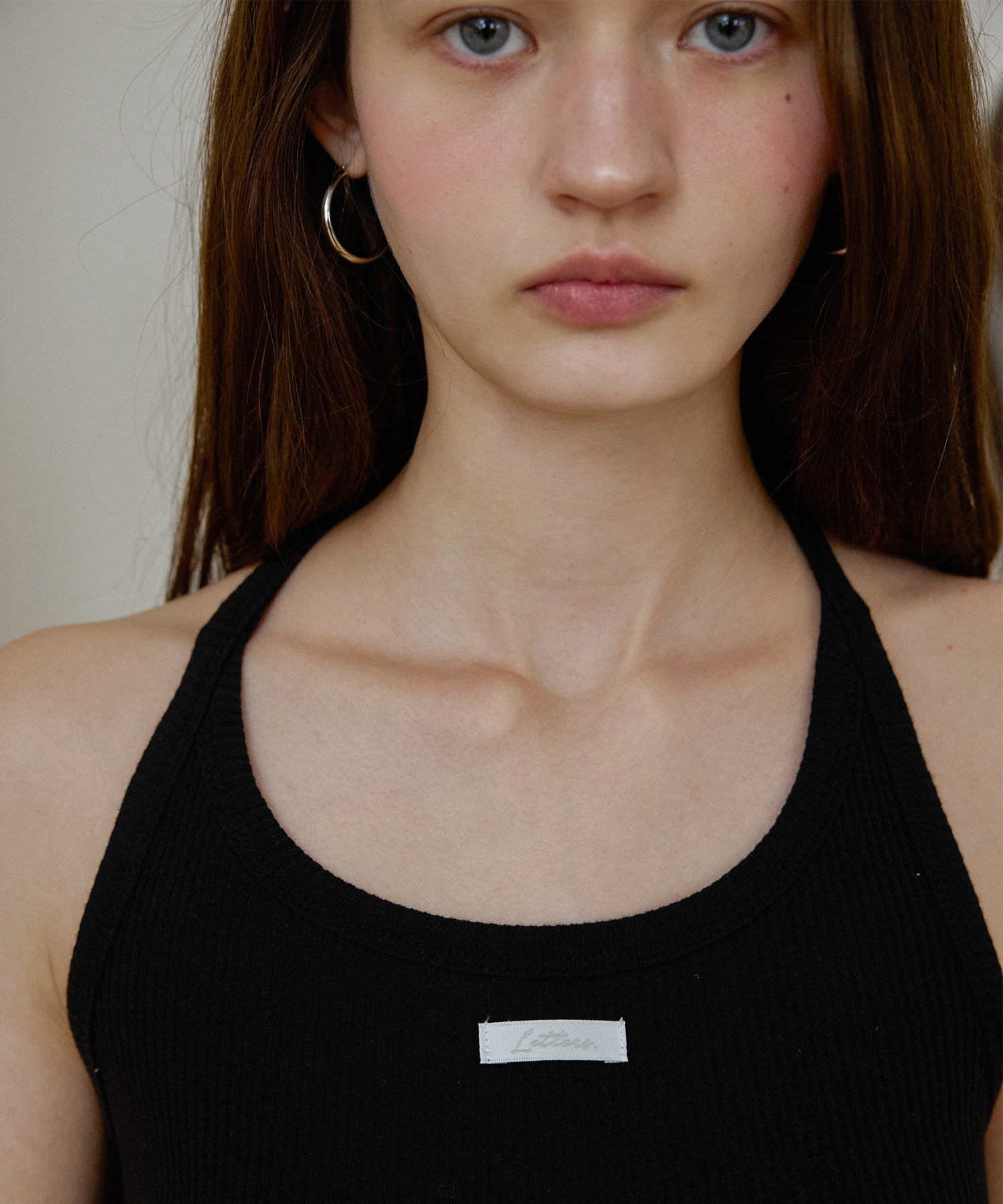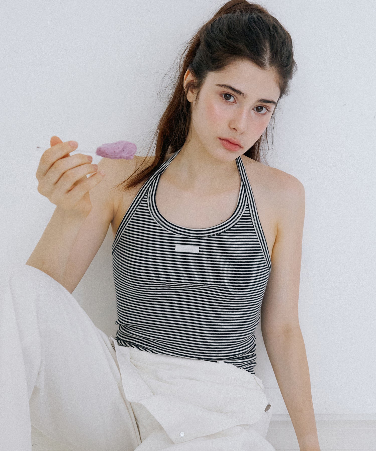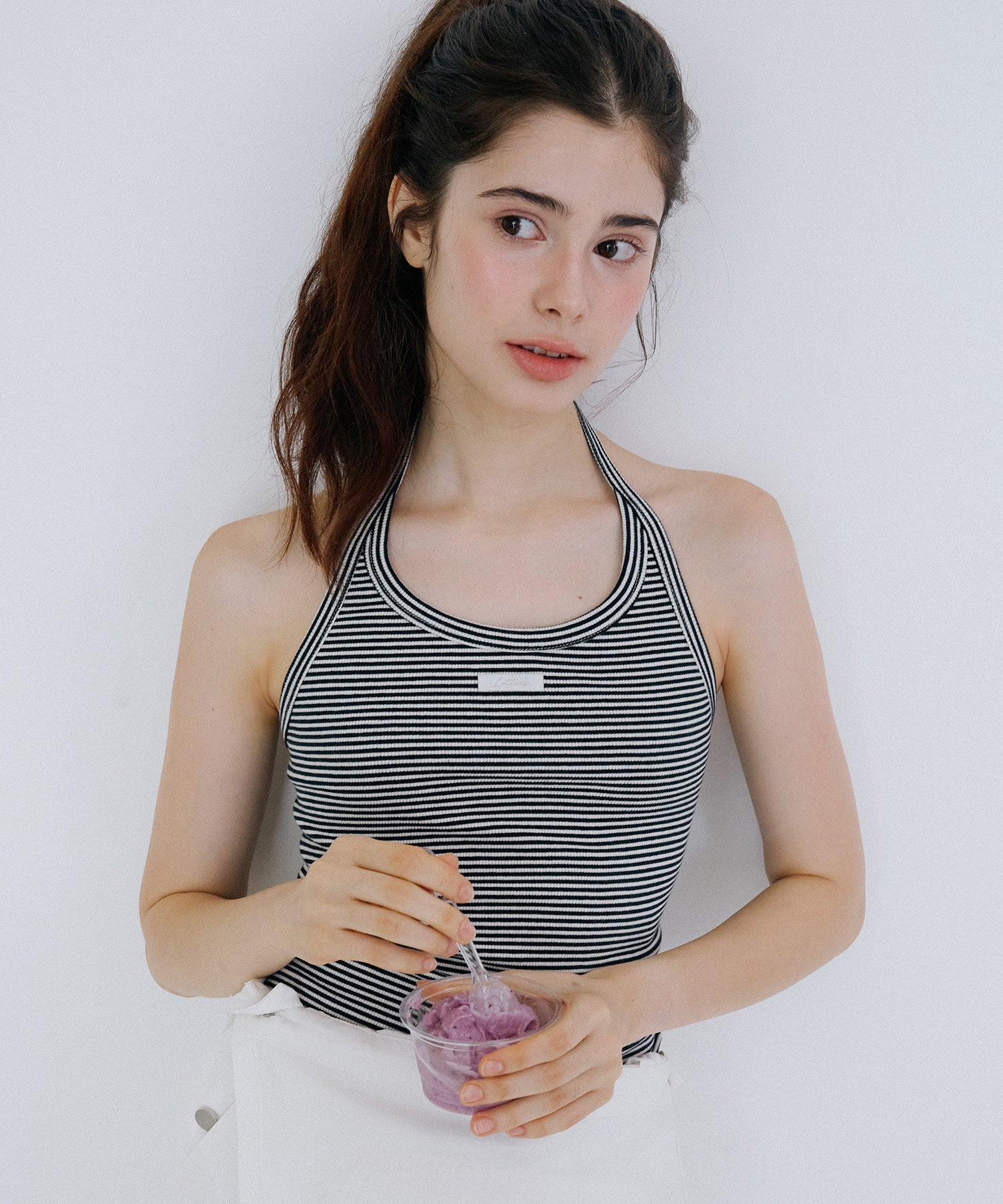 エッセンシャルラベルがポイントのホルターネックスリーブレストップです。