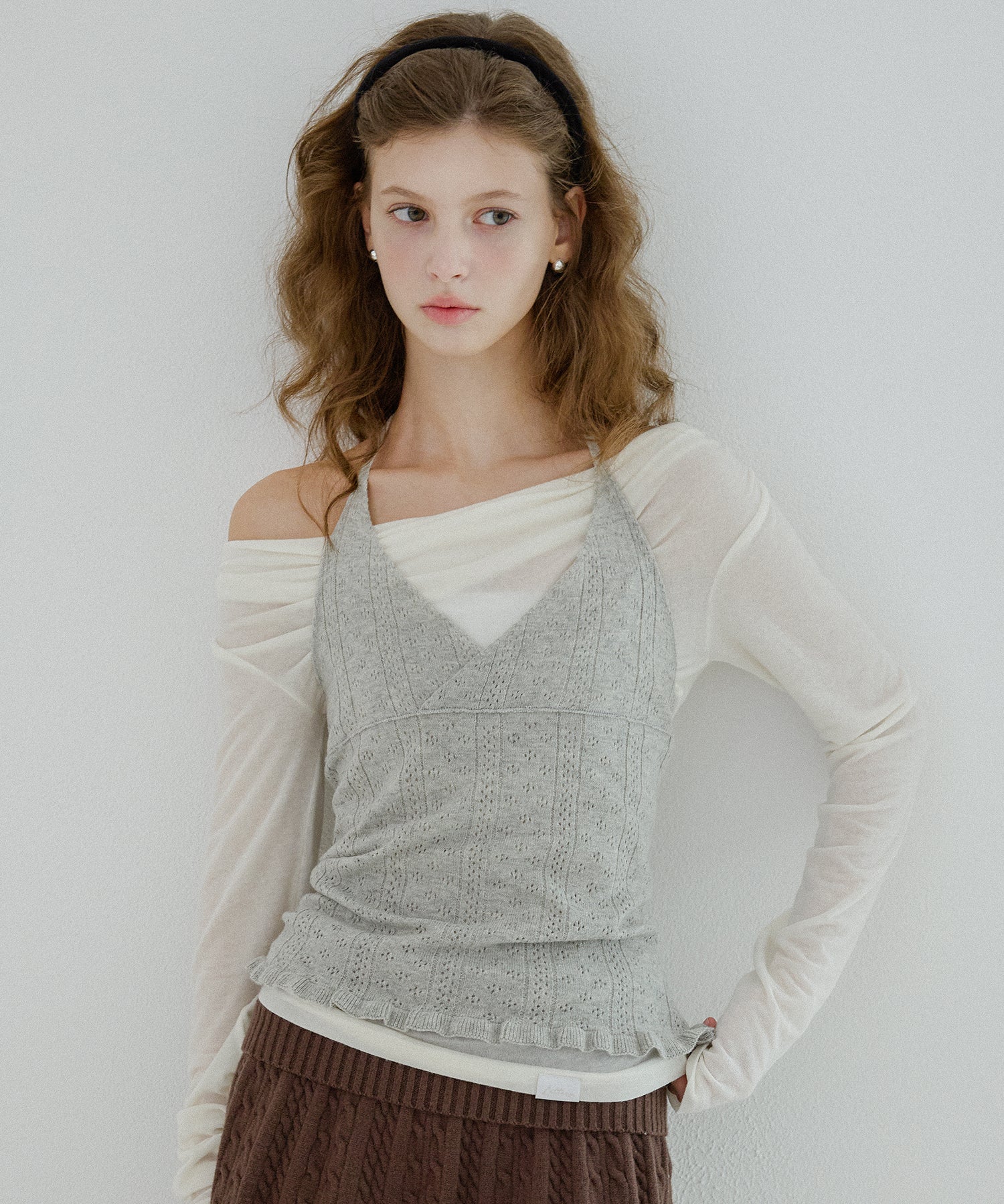 パンチング編みが清涼感と立体感を添えるホルターネックカシミヤベストです。