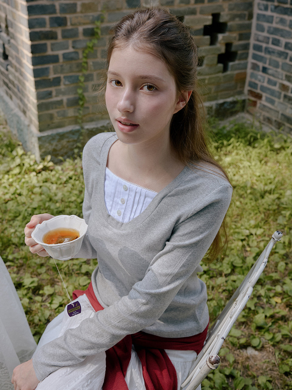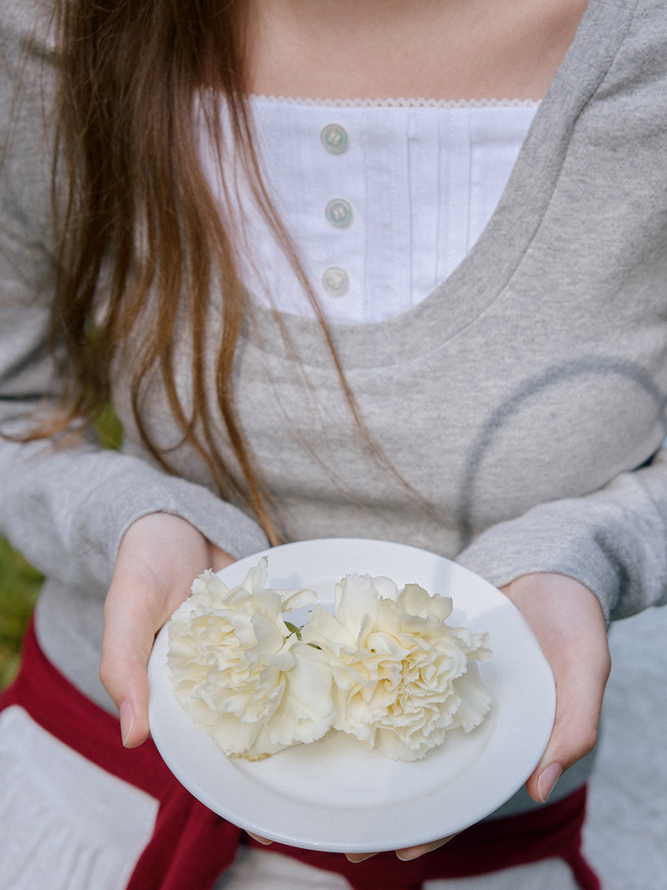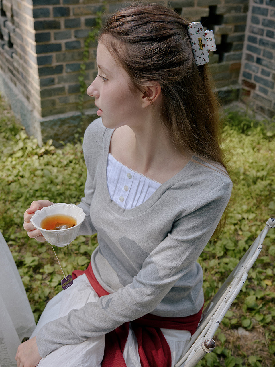シャツ部分には繊細なピンタックとボタンディテールをあしらい、さらにさりげなくあしらわれたレース装飾が上品でフェミニンなムードを添えています。