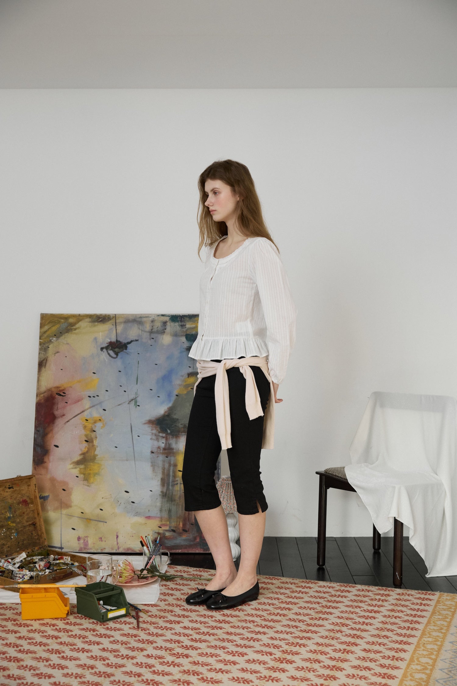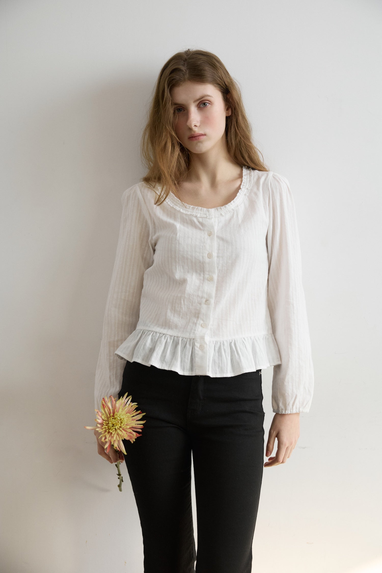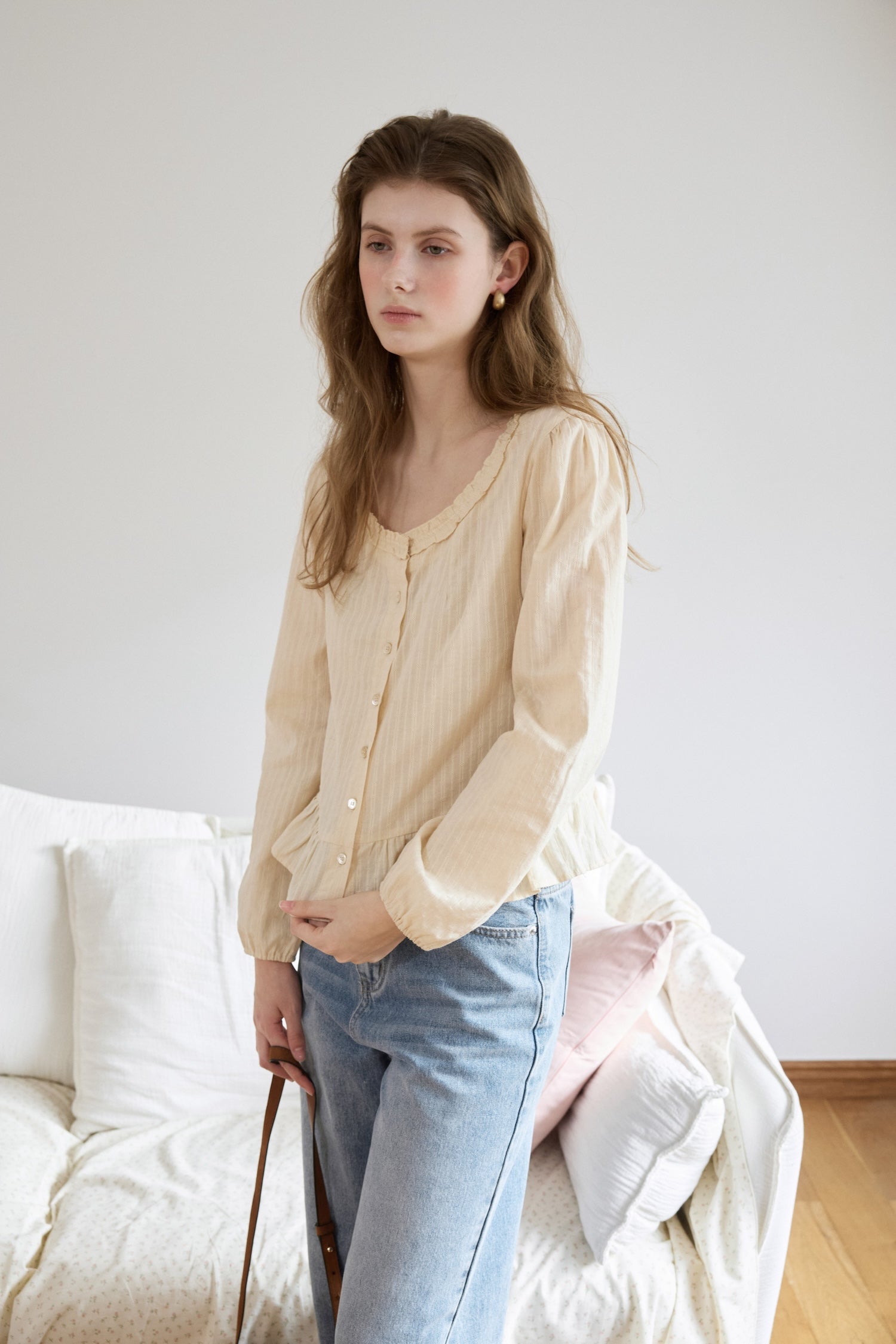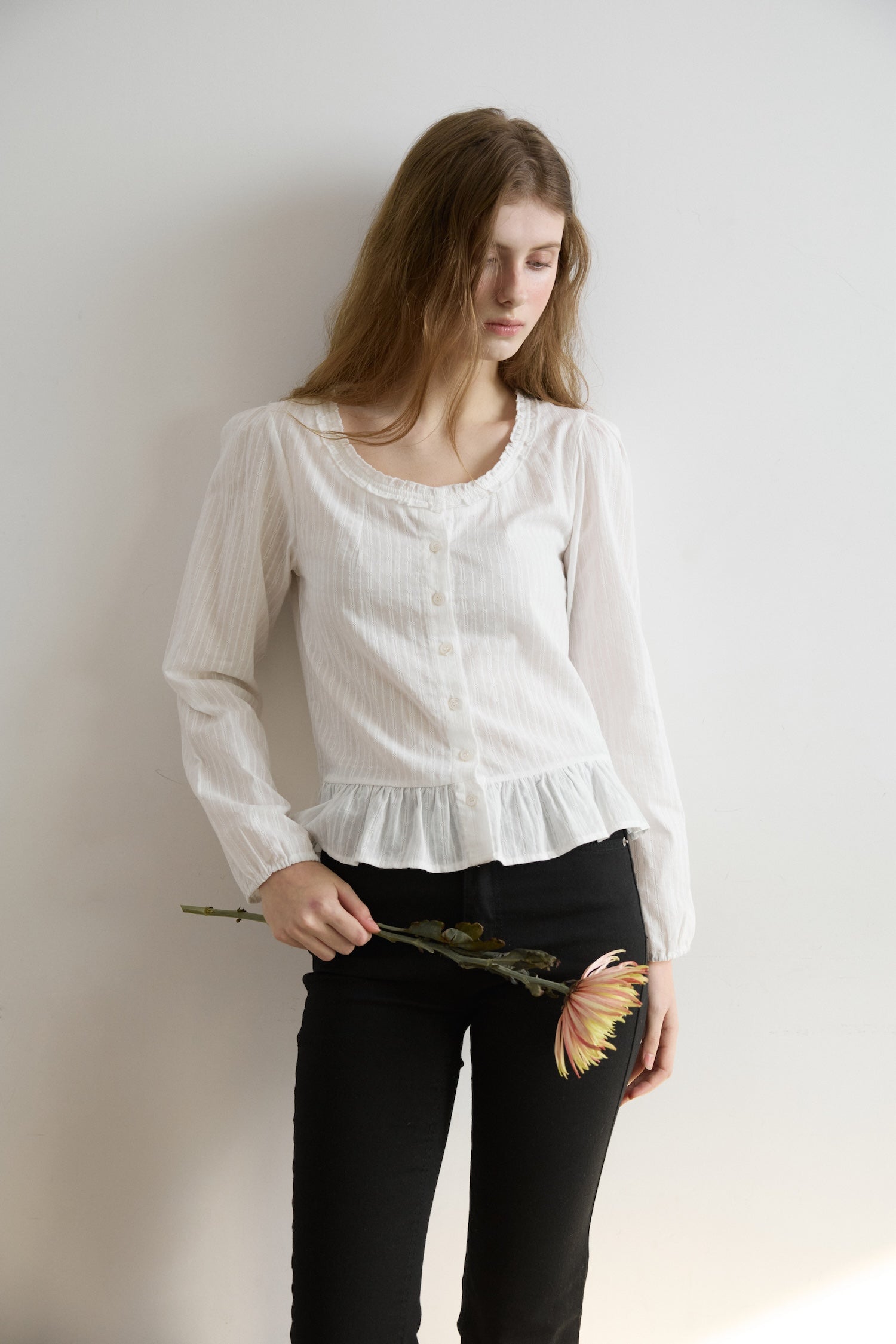 深めのラウンドネックと、共布であしらったフリルが目を惹くブラウスです。