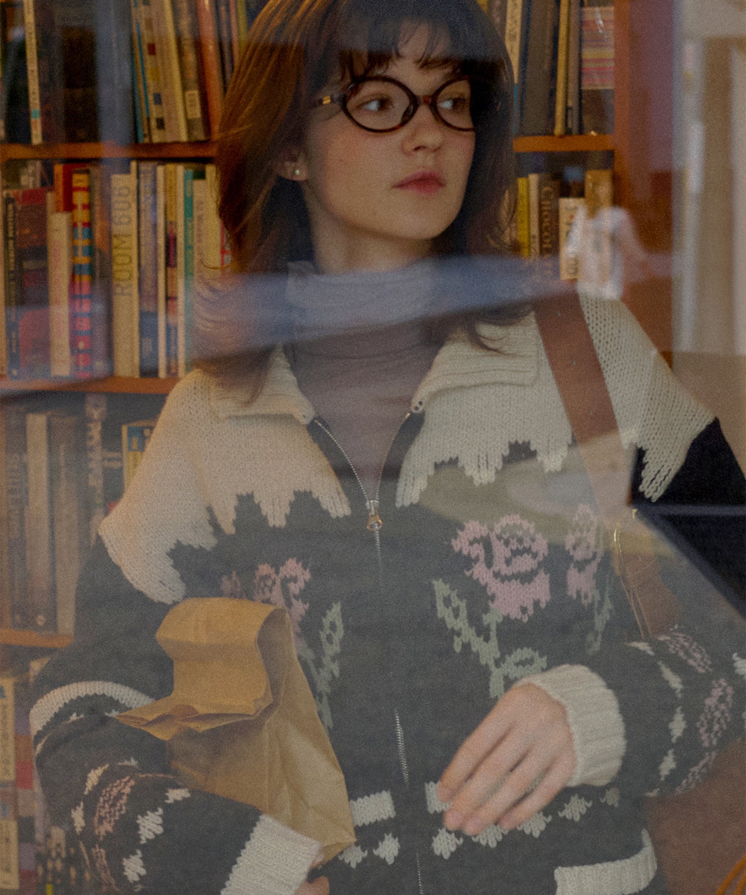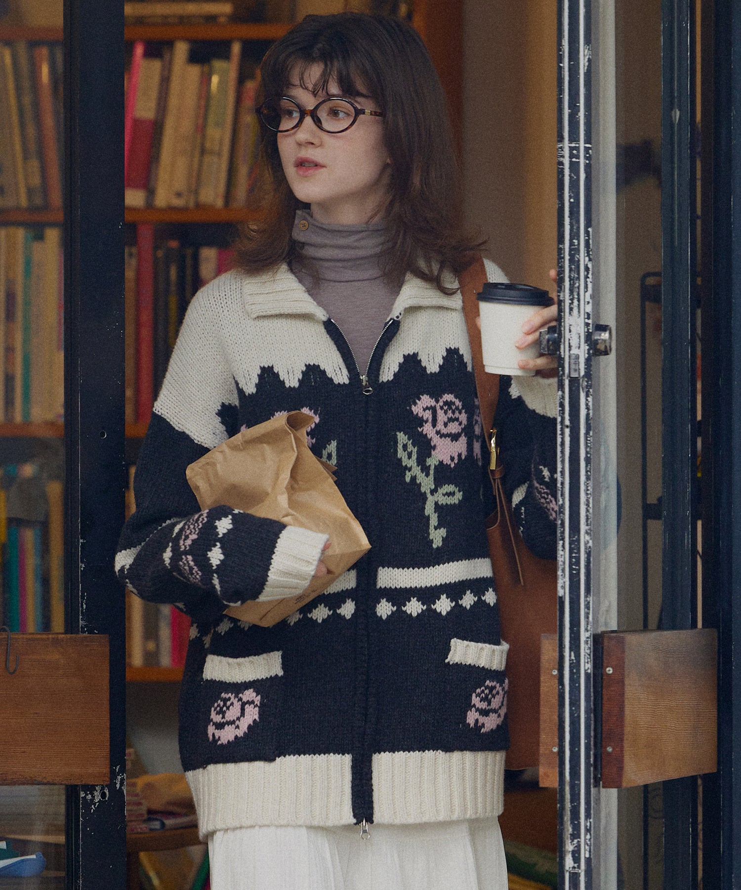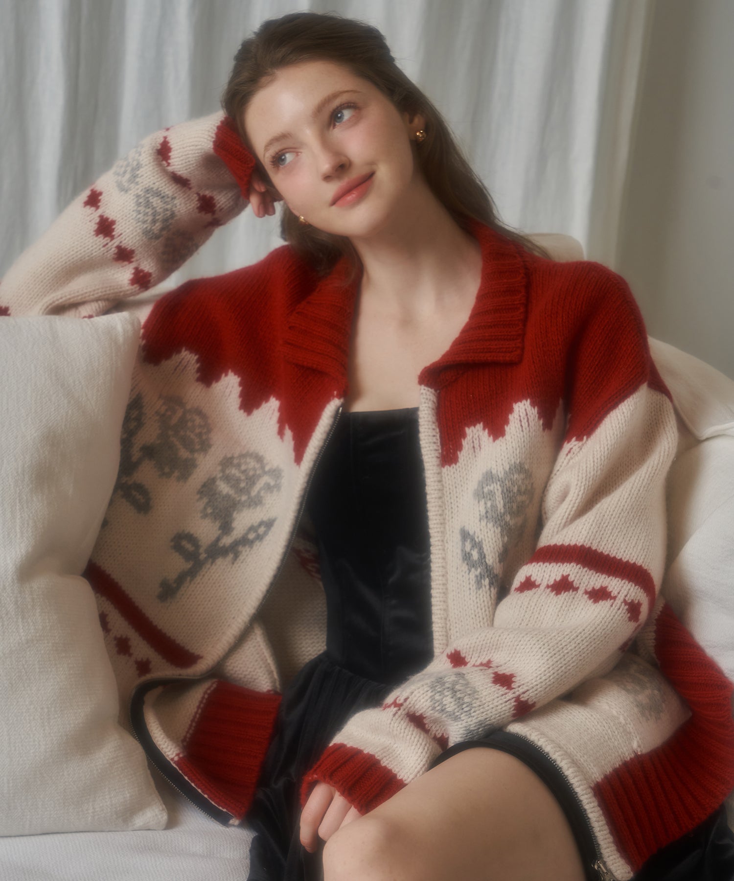 ローズジャカード柄が際立つ、フェミニンな雰囲気のカウチンニットジップアップです。
