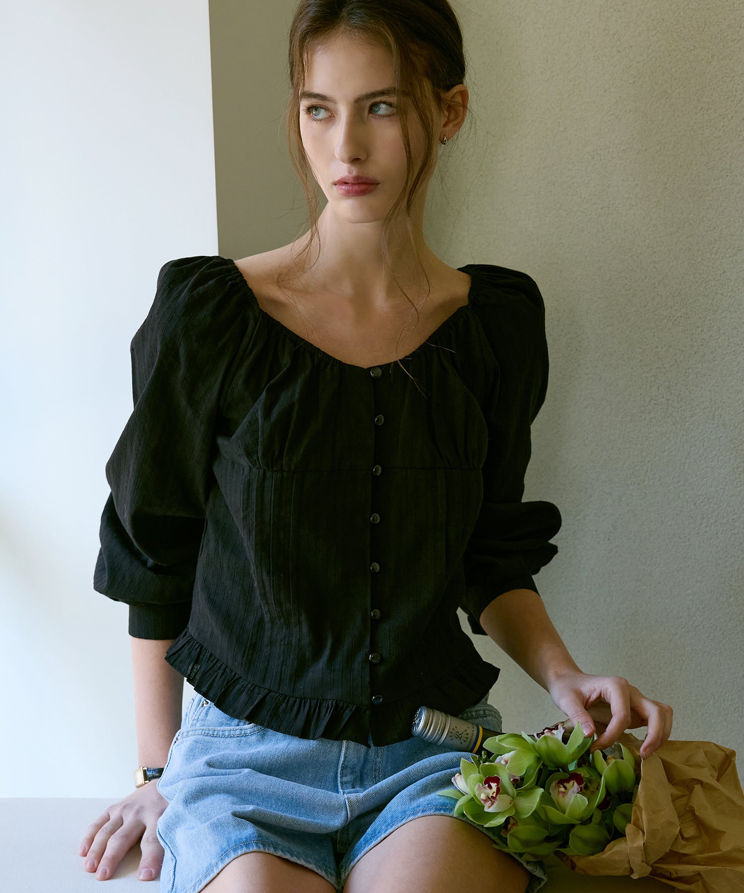 エレガントなラインがポイントのアイレットフリルブラウスです。