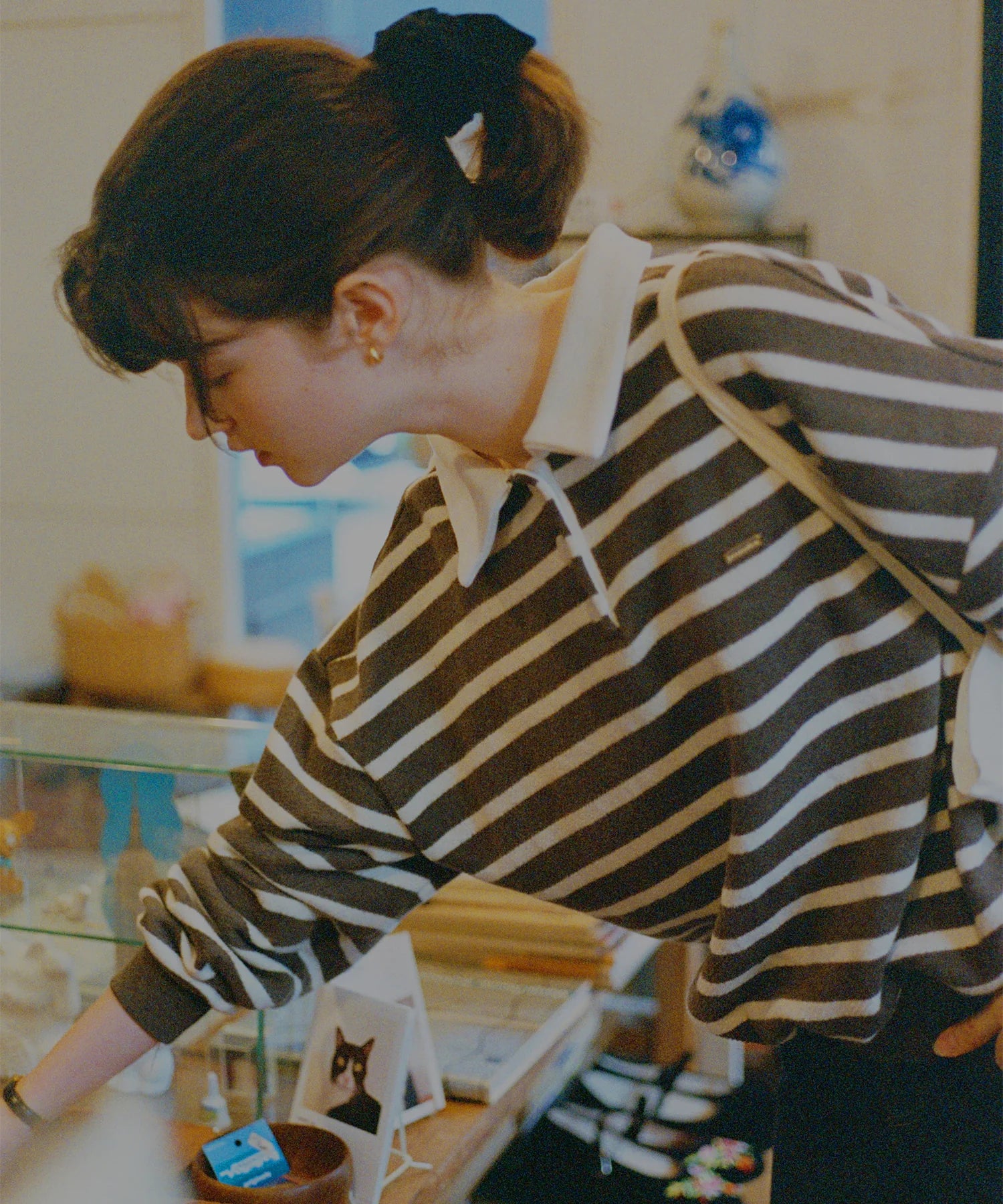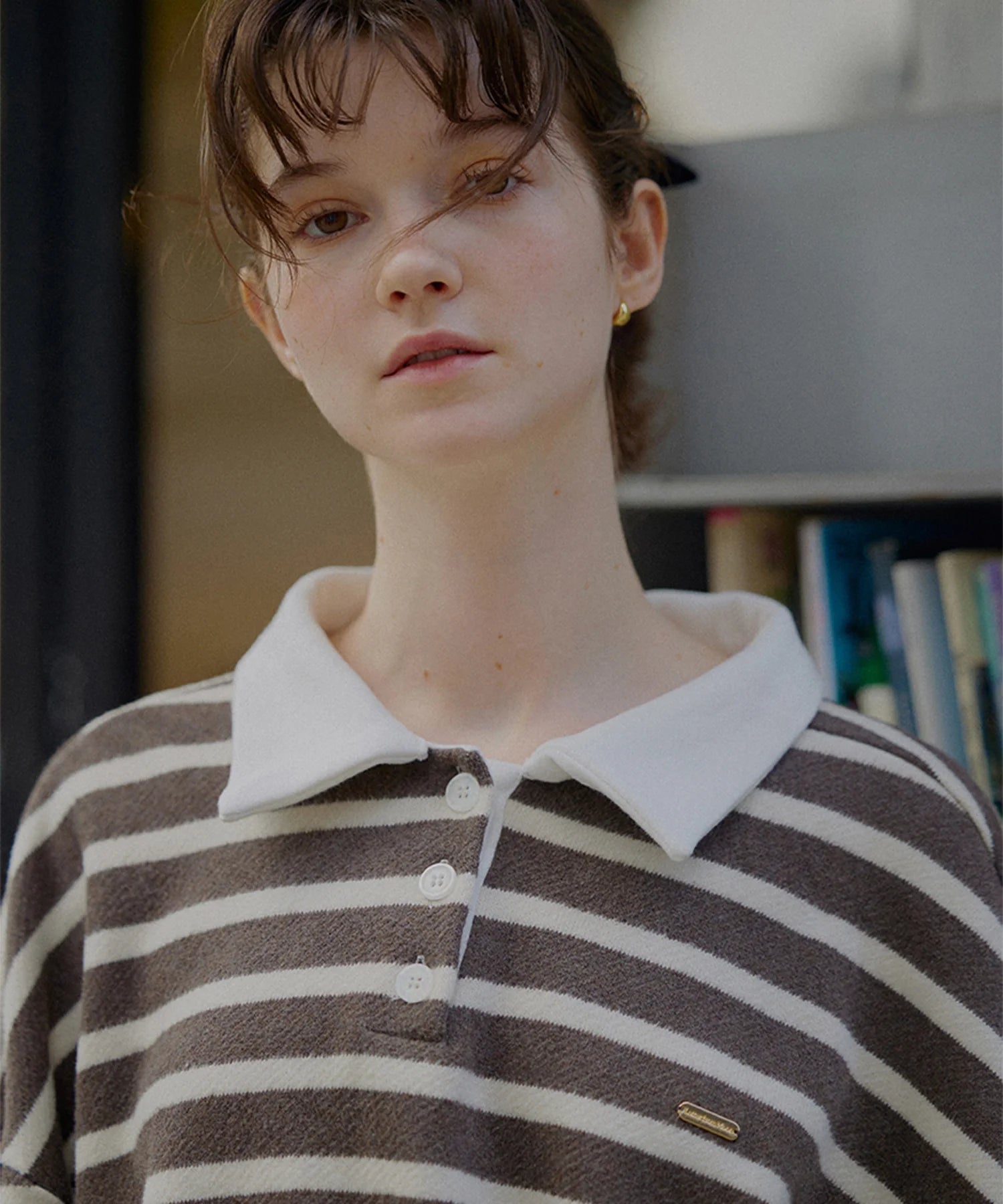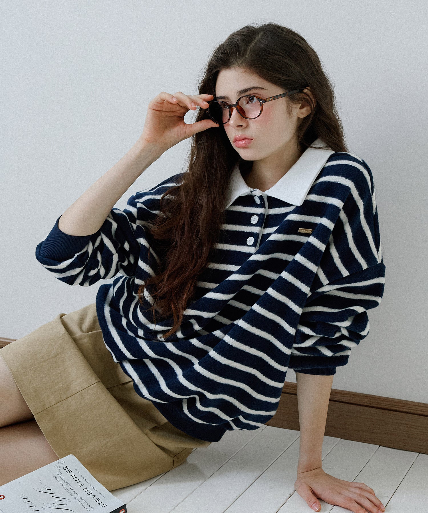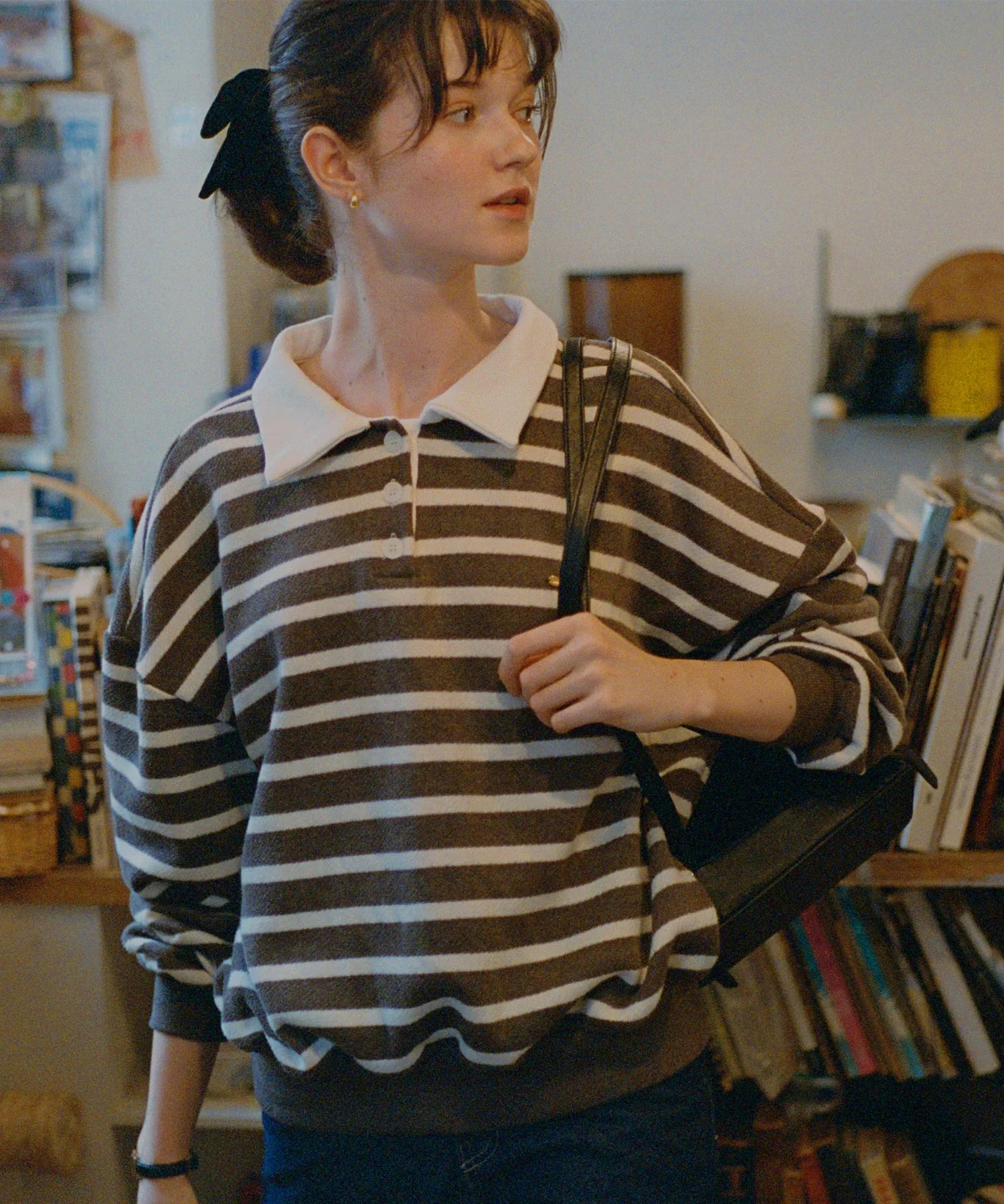 セミオーバーフィットで体型を選ばず快適に着用でき、ドロップショルダーとストライプ柄が相まって女性らしい雰囲気を演出します。