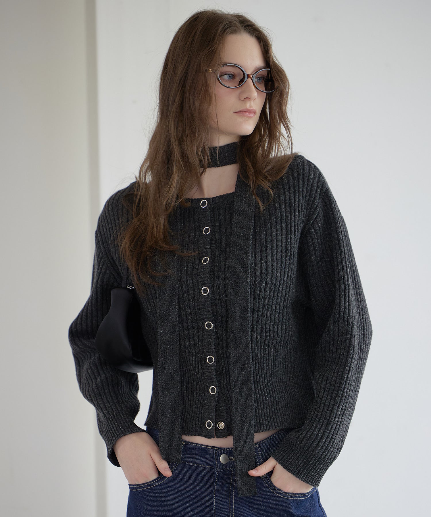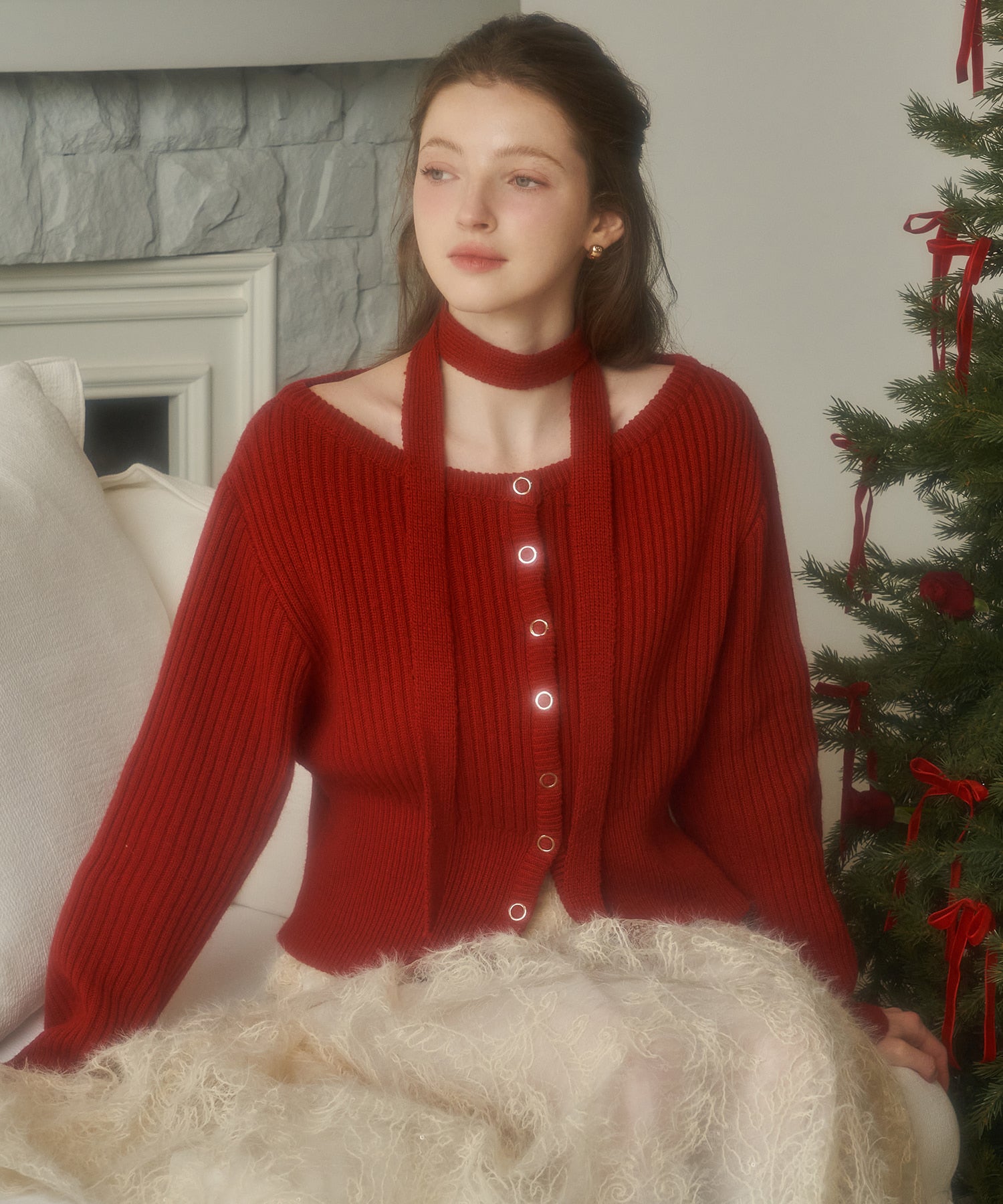 カシミヤ混で柔らかな着心地を実現し、カーディガンとスカーフのセットで単品アイテムとしても活躍度の高い一着です。