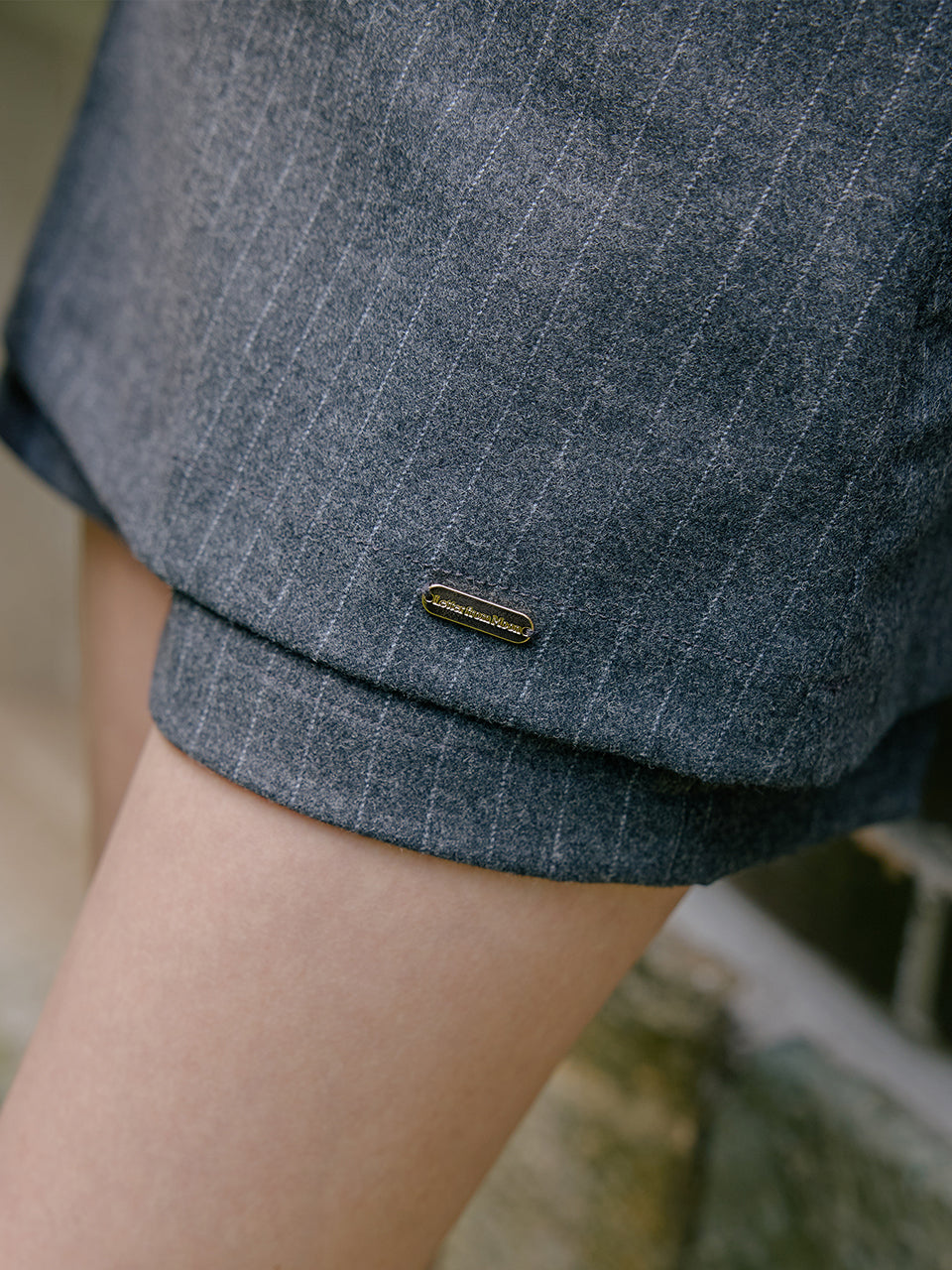 ヒップラインの下にかけて自然に落ちるシルエットはスリムながらもカジュアルな雰囲気を演出し、細かなストライプがクラシックな印象をプラス。